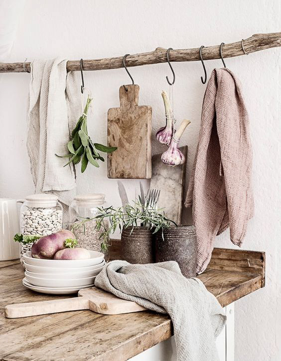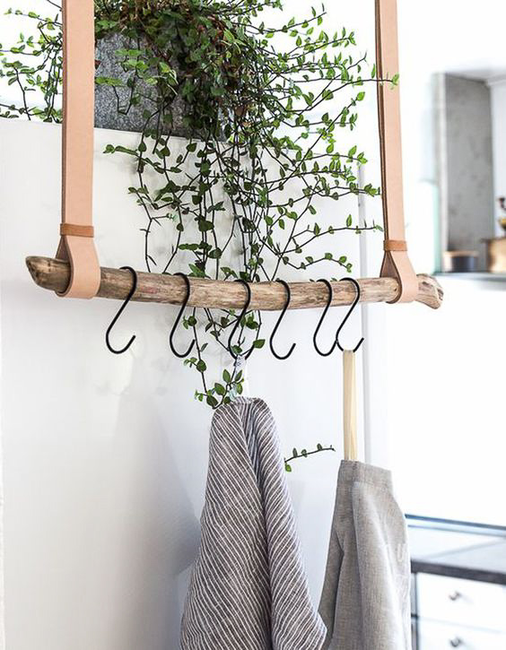Pratiques, les branches d’arbre permettent de suspendre des crochets pour y accrocher des torchons. Pour une touche de nature dans la cuisine !