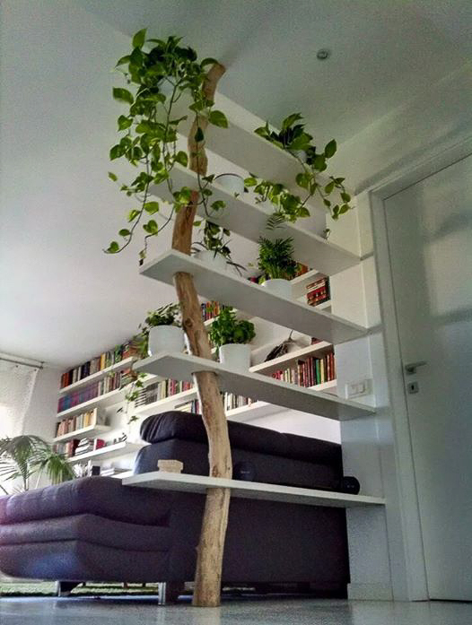 Si vous vous souvenez, il y a quelques temps j’avais réalisé cette petite étagère murale kaki à partir d’une branche de bouleau. Si l’idée vous plaît, je vous ai aussi trouvé son grand frère avec cette bibliothèque branche d’arbre !