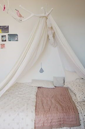Dormir sous les arbres, vous en rêvez ? Ces ciels de lit sont faits pour vous ! Gros coup de cœur pour le premier ciel de lit de cette chambre d’enfant avec cette branche peinte en blanc. Tellement poétique !