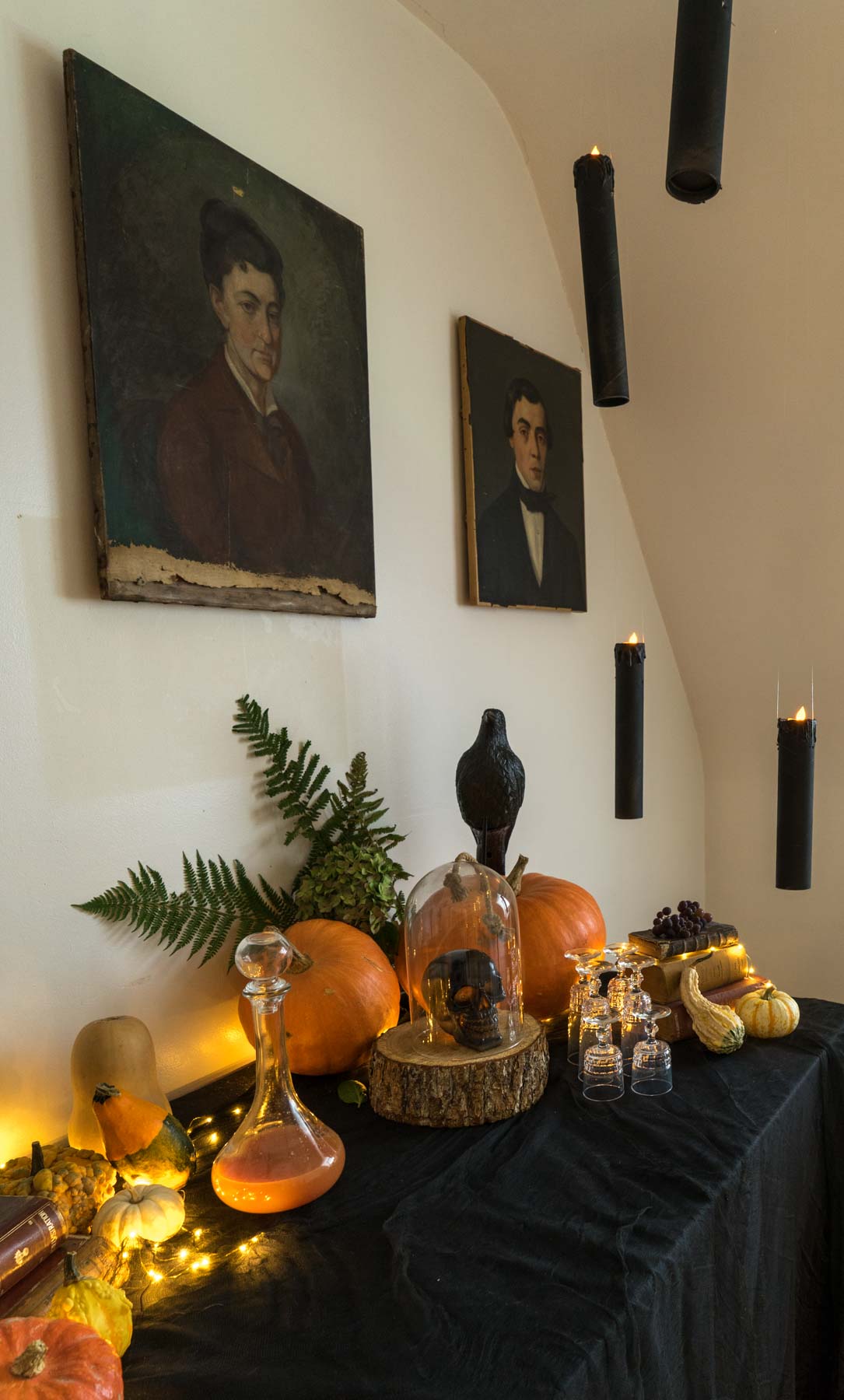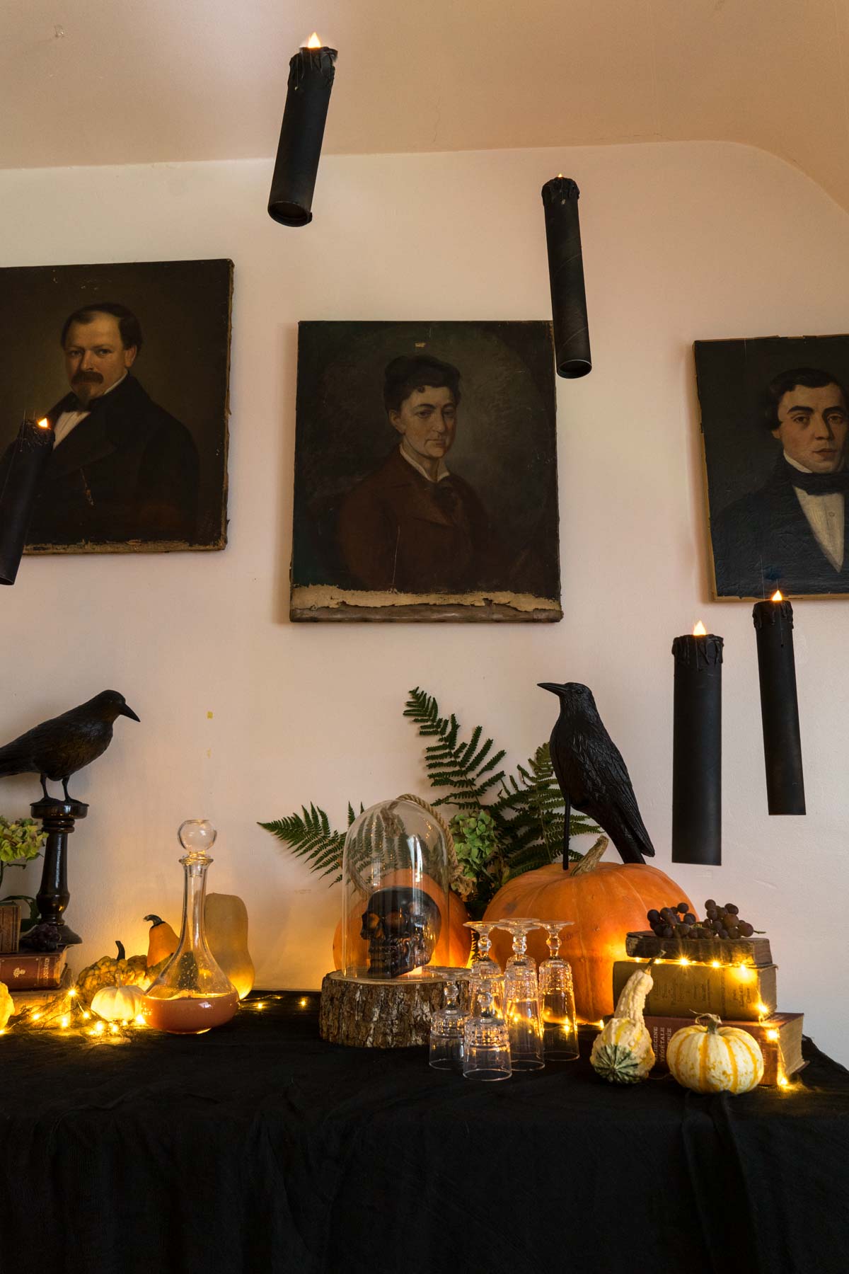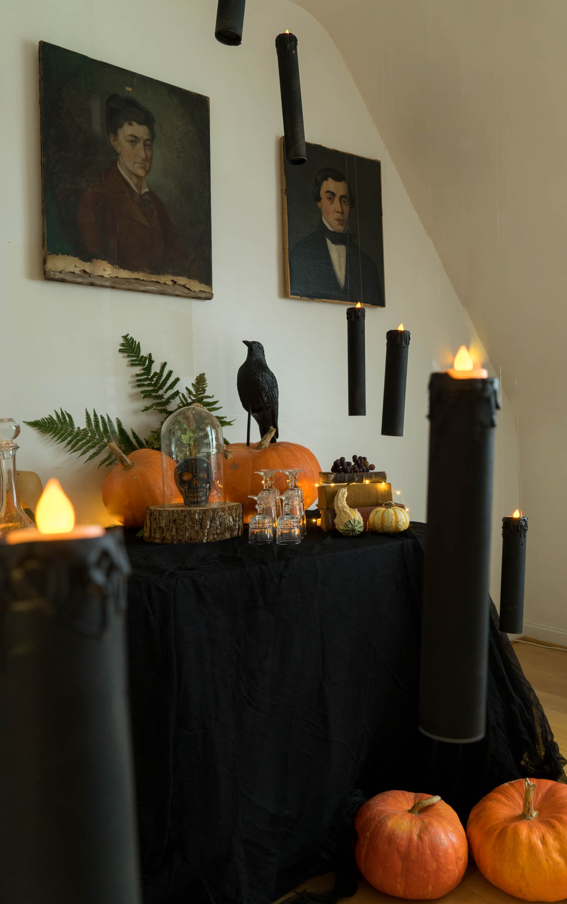 Les autres stars du décor, ce sont ces fausses bougies qui flottent dans les airs. Je voulais qu’elles lévitent et dansent dans la pièce, portées par des forces obscures ;). Je les ai réalisées à partir de bougies leds et de tubes en carton, et j’ai ensuite installé des crochets Command™ au plafond pour les suspendre grâce à un fil transparent. J’aurai aimé pouvoir vous inviter à la fête, l’effet lorsqu’on circule entre les bougies en lévitation est vraiment très chouette, et un peu effrayant ! Pour vous balader dans le décor, rendez-vous sur ce post Instagram où une petite vidéo vous attend ;).
