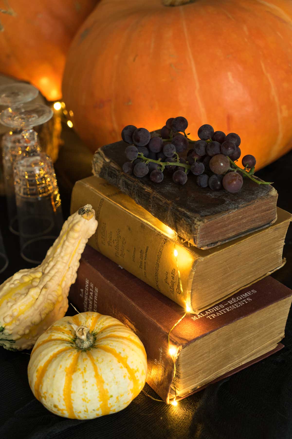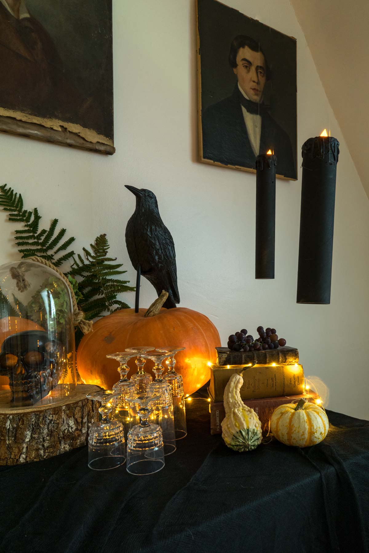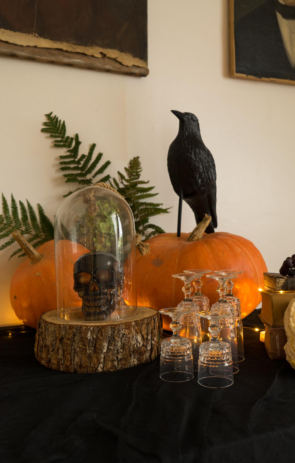 Je voulais absolument des corbeaux noirs dans mon décor : j’ai trouvé mon bonheur avec ces épouvantails à pigeons. Les corbeaux peuvent, au choix, s’installer sur des pieds pour être posés, ou sur un pic qui permet de les planter dans les citrouilles. J’avais déjà le rondin de bois qui me sert régulièrement en décoration de table, la cloche en verre provient d’un petit terrarium, et la tête de mort est une tirelire bombée en noire, achetée dans un magasin de destock (une similaire disponible ici). Les hortensias, fougères et grappes de raisins proviennent du jardin de mes parents et les vieux livres de leur bibliothèque.