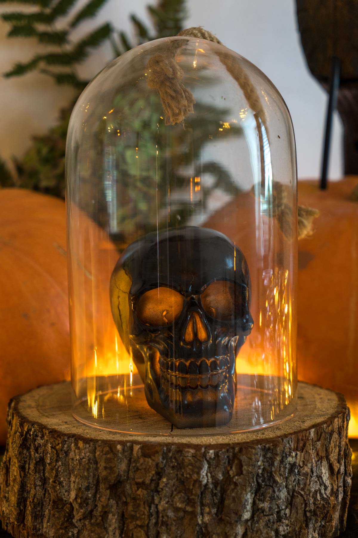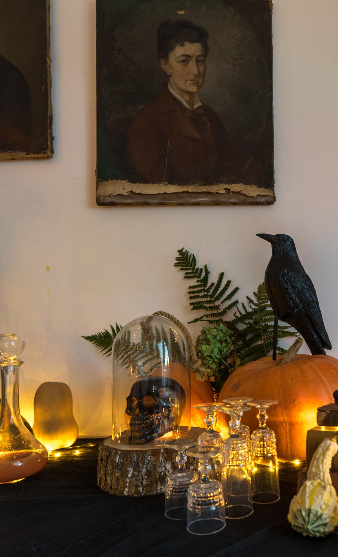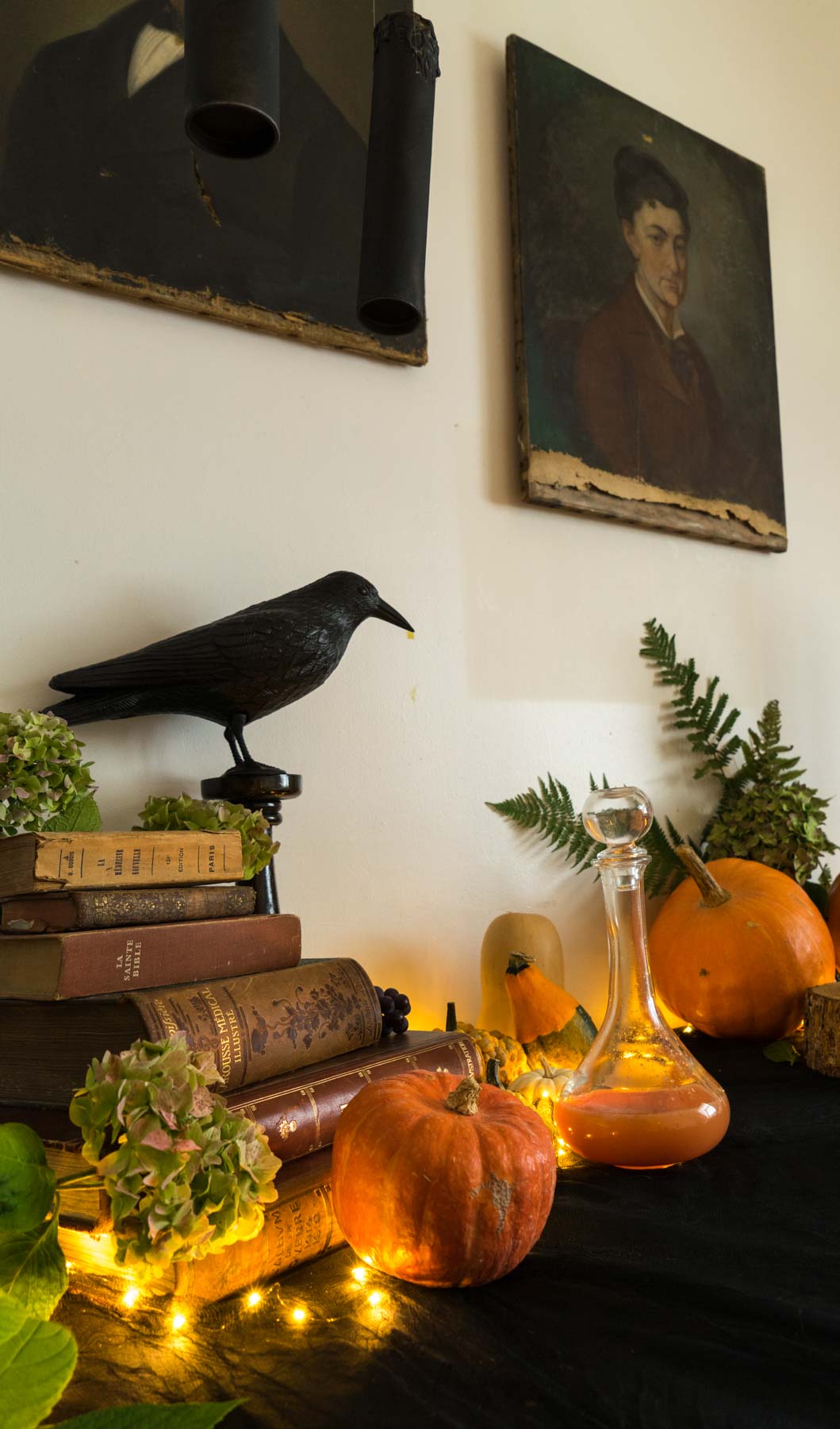 Je voulais absolument des corbeaux noirs dans mon décor : j’ai trouvé mon bonheur avec ces épouvantails à pigeons. Les corbeaux peuvent, au choix, s’installer sur des pieds pour être posés, ou sur un pic qui permet de les planter dans les citrouilles. J’avais déjà le rondin de bois qui me sert régulièrement en décoration de table, la cloche en verre provient d’un petit terrarium, et la tête de mort est une tirelire bombée en noire, achetée dans un magasin de destock (une similaire disponible ici). Les hortensias, fougères et grappes de raisins proviennent du jardin de mes parents et les vieux livres de leur bibliothèque.