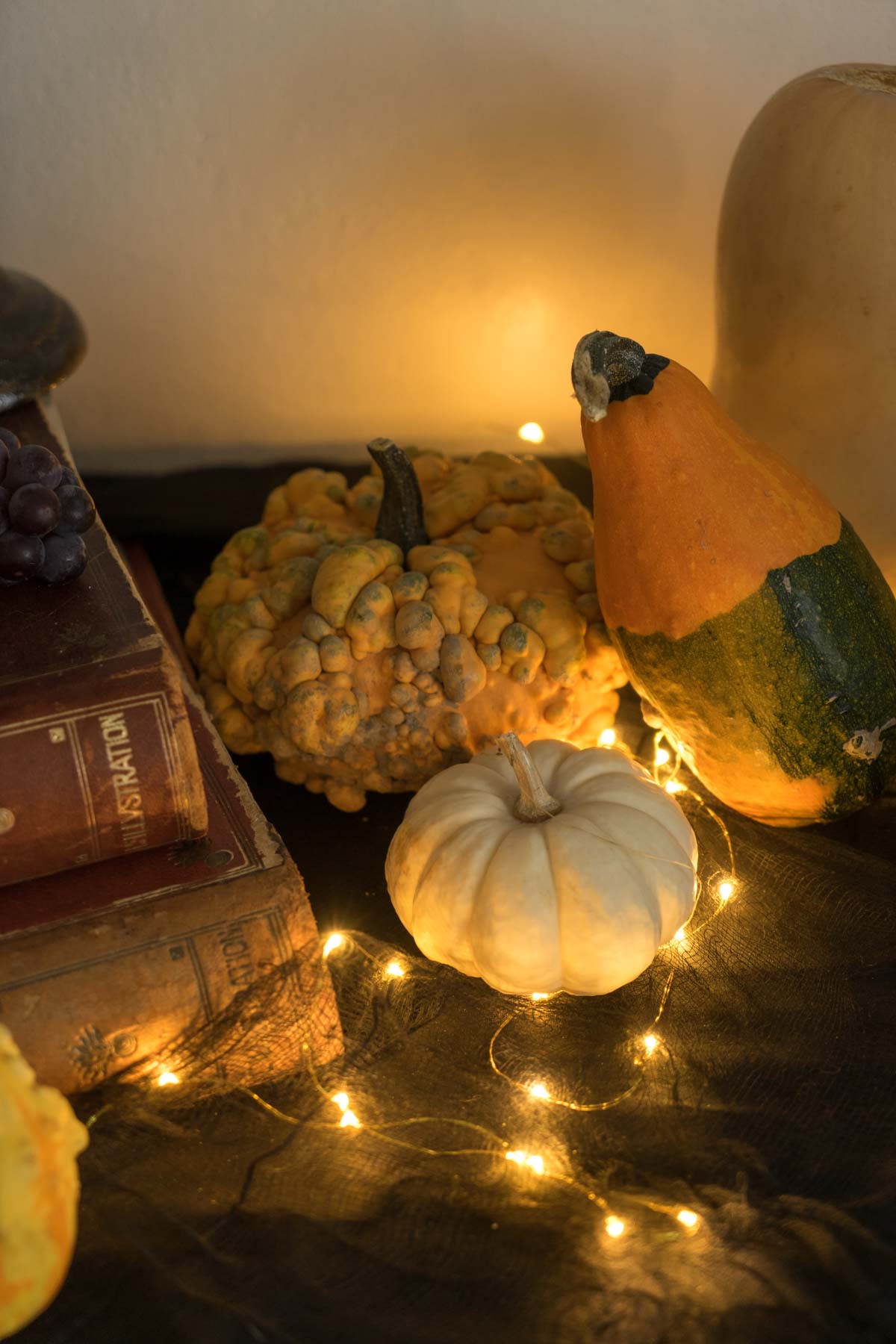 Pour le reste, rien de bien compliqué : j’ai recouvert la table d’une grande nappe noire (un drap en réalité, acheté dans un supermarché pour 4.90 € !). Le tissu étant très fin, j’y ai superposé une mousseline de coton noire pour apporter un peu d’épaisseur. J’ai ensuite ajouté plusieurs citrouilles, de tailles et de variétés différentes. Pour les grosses citrouilles, je les ai acheté sur Le bon coin. Je vous conseille d’aller y jeter un œil, beaucoup de particuliers en proposent à petit prix à cette période. Ici les plus grosses m’ont coûtées 5 euros ! J’ai trouvé les plus petites au marché, sur un stand qui proposait des variétés originales.