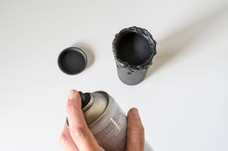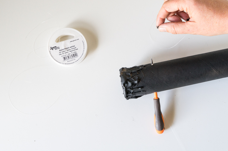 Une fois la colle sèche, bombez l’ensemble des bougies, en prenant soin de bien peindre également le bouchon du dessous. Pour cela bombez-les séparément et replacez-les ensuite une fois secs. Il ne vous reste plus qu’à passer un fil de nylon dans les trous percés à l’étape précédente. Aidez-vous d’une grande aiguille ou d’un petit tournevis plat pour guider le fil au travers du tube.