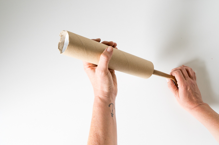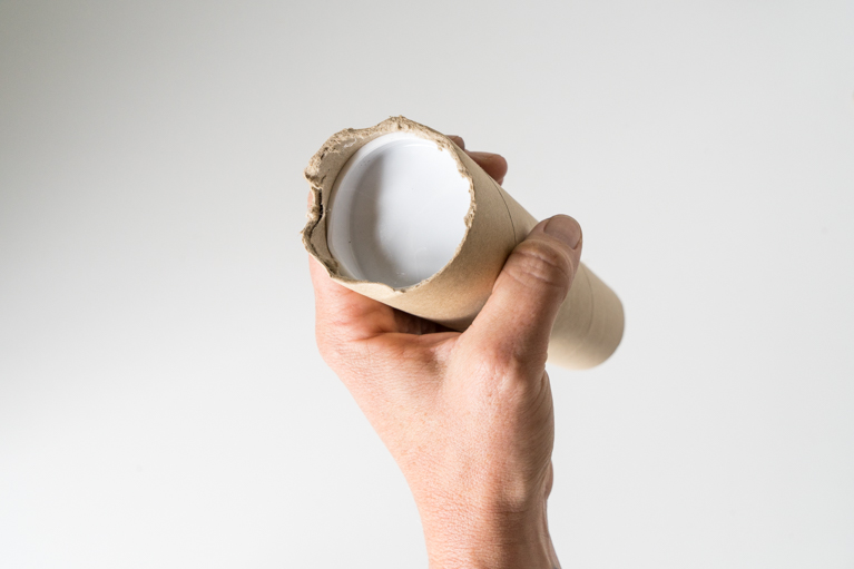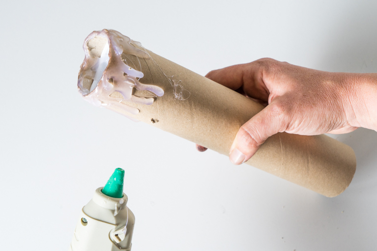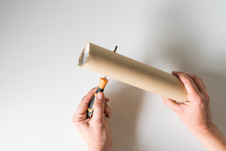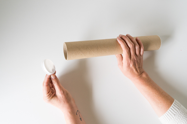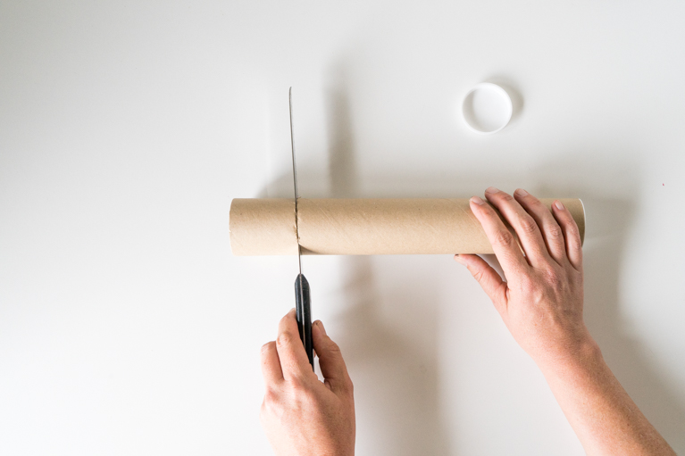 Retirez les bouchons des tubes de carton, et découpez une extrémité des tubes pour obtenir des hauteurs différentes de bougies. Les tubes se découpent facilement, ici j’ai utilisé un grand couteau de cuisine, vous pouvez aussi utiliser une petite scie à onglet par exemple si vous préférez. La découpe n’a pas besoin d’être nette.
