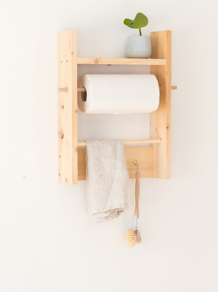 La cuisine, un endroit ou la fonctionnalité doit être le maîre mot ! Dans cette idée, j’ai imaginé un DIY étagère de cuisine, qui permettrait d’installer le rouleau d’essui tout, ainsi que de suspendre torchons et petits acessoires. Une petite étagère permet aussi d’accueillir les plantes ou encore les épices !