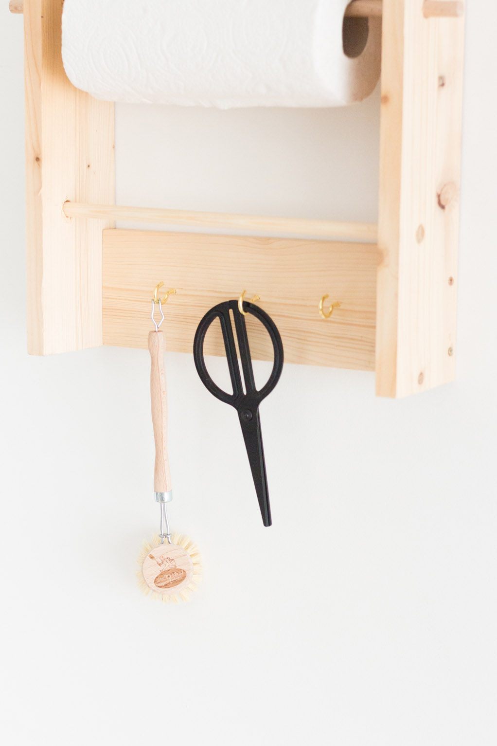Le sopalin, les torchons, les ciseaux… autant de choses qui, chez moi, encombrent souvent le plan de travail ! Ma solution, c’est ce petit DIY étagere de cuisine imaginé dans le cadre de mon travail pour 18h39. Le rouleau de sopalin s’installe et s’enlève très facilement, et les petits crochets dorés sont idéals pour suspendre tous les ustensiles de cuisine.