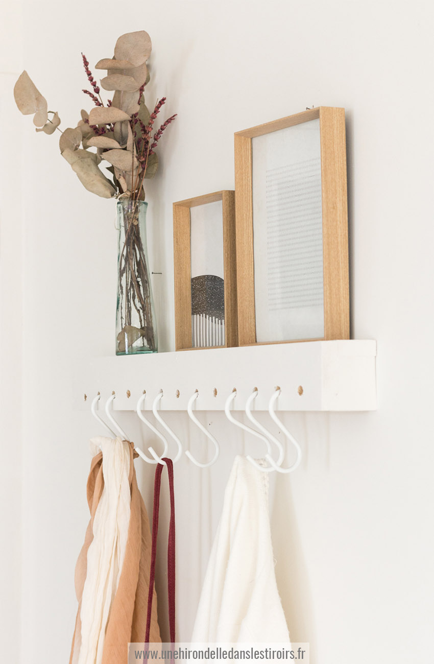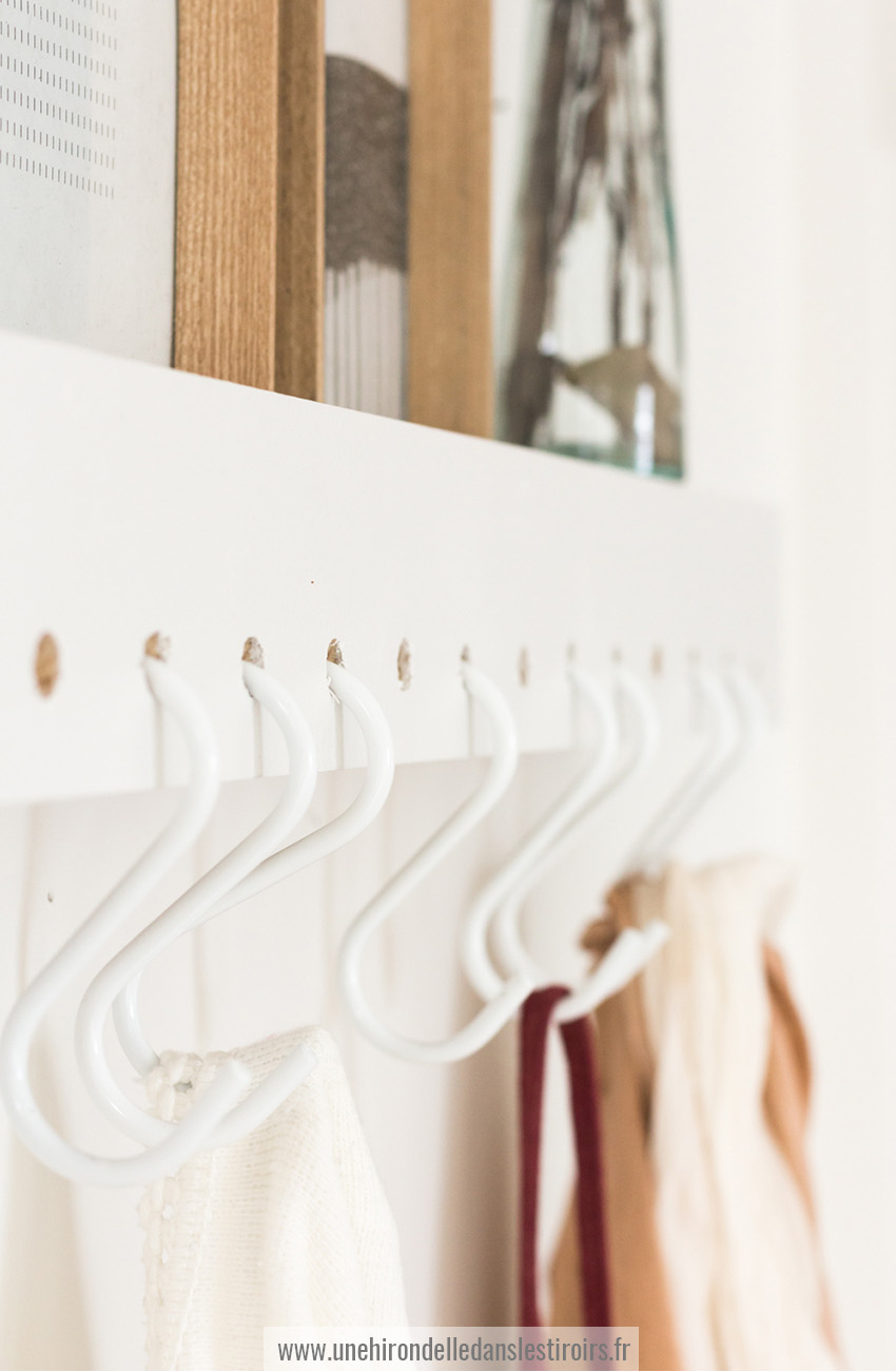 Ici, j’ai choisi de peindre mon meuble en blanc pour le fondre au mur, mais vous pouvez également jouer les contraste. Comme tout DIY, vous pourrez également adapter ses dimensions à votre pièce, pour un meuble sur mesure ! Il peut également être très utile dans une petite cuisine par exemple, pour y suspendre torchons et maniques.