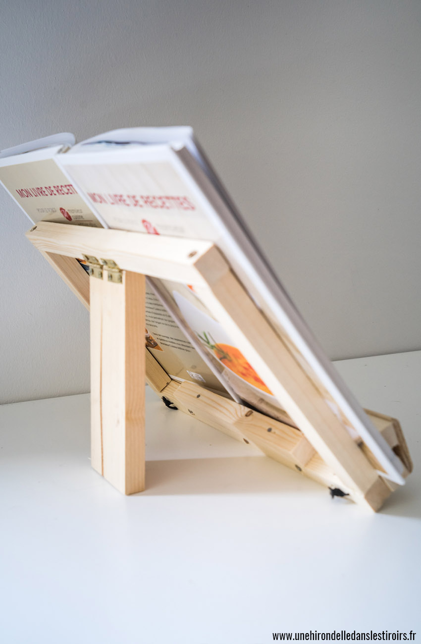 Vous aimez cuisiner en vous inspirant de beaux livres sur le sujet ? Vous tenez un cahier de recettes ? Ce DIY lutrin de cuisine repliable pourrait vous être utile! En ce qui me concerne, si je cuisine avec un livre posé sur le plan de travail, il fini presque immanquablement avec des tâches de beurre fondu ou autres. De plus, un livre à plat prend beaucoup de place. Et ce n’est pas vraiment le plus pratique d’être penchée au dessus pour lire! Pour remédier à ca, je le posais parfois en équilibre contre le mur, mais il avait tendance à tomber et les pages à se tourner seule. Bref, vous l’aurez compris, l’idée de réaliser ce DIY lutrin de cuisine repliable sort tout droit de ma cuisine !