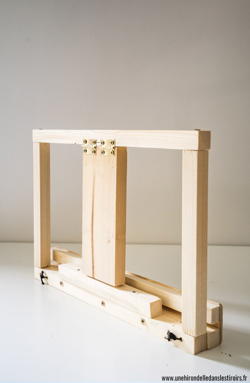 Une fois le cahier des charges de mon DIY lutrin de cuisine repliable défini, je me suis donc attaquée à la réalisation. J’ai commencé par créer un cadre à l’aide de tasseaux et de vis. J’ai ensuite ajouté une section de bois épaisse au dos, reliée par deux petites charnières pour servir de pied. Enfin, j’ai créé un rebord sur le bas du cadre pour y poser mes livres. J’y ai ajouté un système de cale pages à l’aide d’un champlat et d’un élastique. En une heure, c’était fait ! Et pour les dimensions, la liste du matériel et le pas à pas, cela se passe comme d’habitude PAR ICI.
