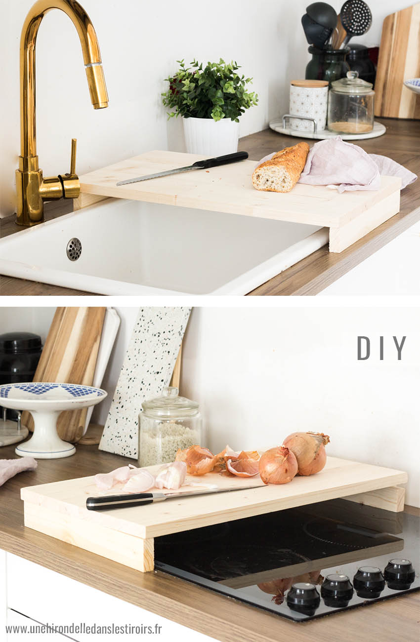 Et si vous cherchez d’autres astuces gain de place et organisation pour la cuisine, j’ai réalisé plusieurs DIY pour se faciliter la vie dans cette pièce. Par exemple, ce DIY range épices ou encore cette planche à découper gain de place !