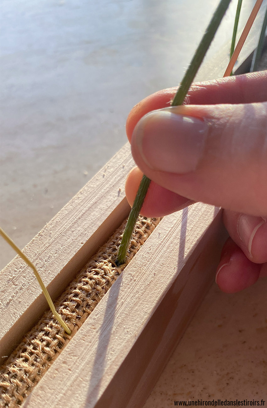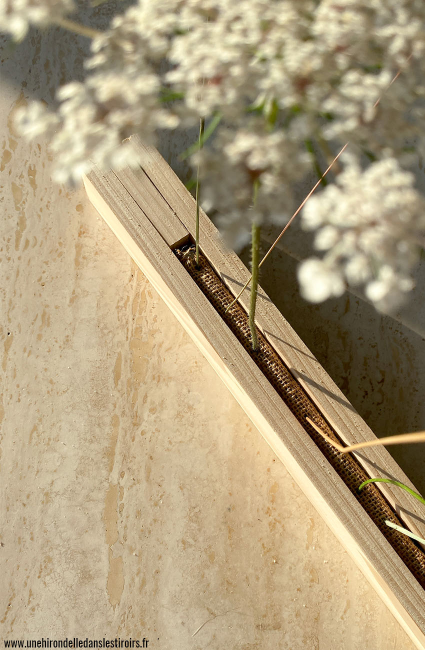 J’ai commencé par découper une bande de mousse de la longueur désirée et de l’épaisseur de mon tasseau. Cela se fait très bien au couteau à pain. J’ai ensuite coupé 2 grandes sections de tasseaux pour venir l’enserrer, et 2 petites pour les placer aux extrémités. J’ai fixé la mousse au bois à l’aide de petits clous, en prenant soin de la recouvrir de jute pour que cela soit plus esthétique. Vous pouvez évidement utiliser un autre matériau, l’essentiel étant que les mailles/le tissage soit suffisamment lache pour permettre de piquer les tiges sur la mousse au travers.