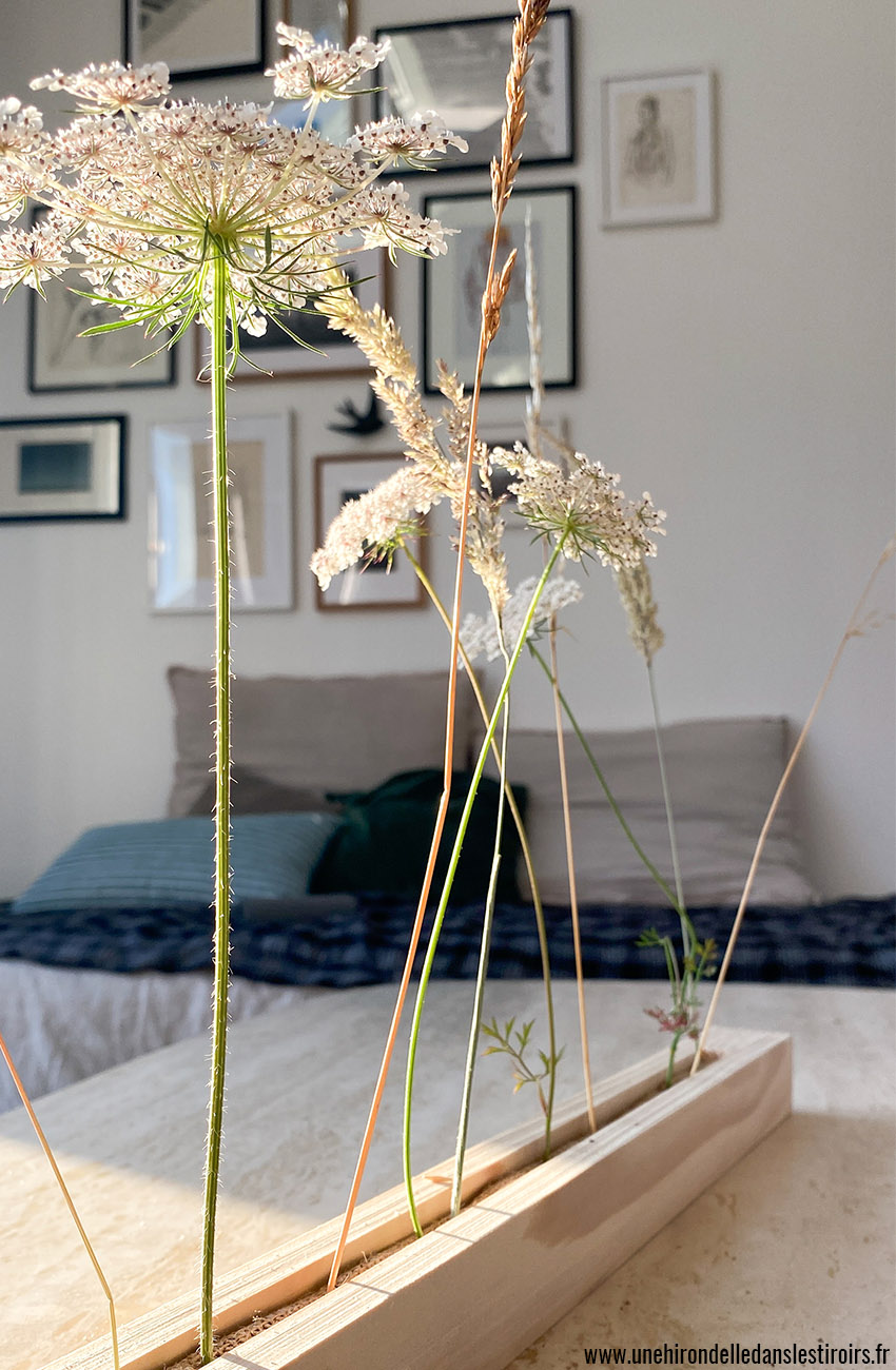 Pour ces photos, j’ai simplement cueilli quelques fleurs de carottes sauvages sur le bord de la route devant chez moi, et quelques herbes hautes de mon jardin. J’adore les ombres créées par cette composition minimaliste lorsqu’on la place dans le soleil !