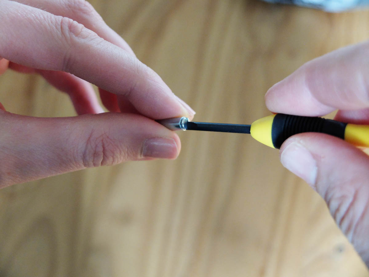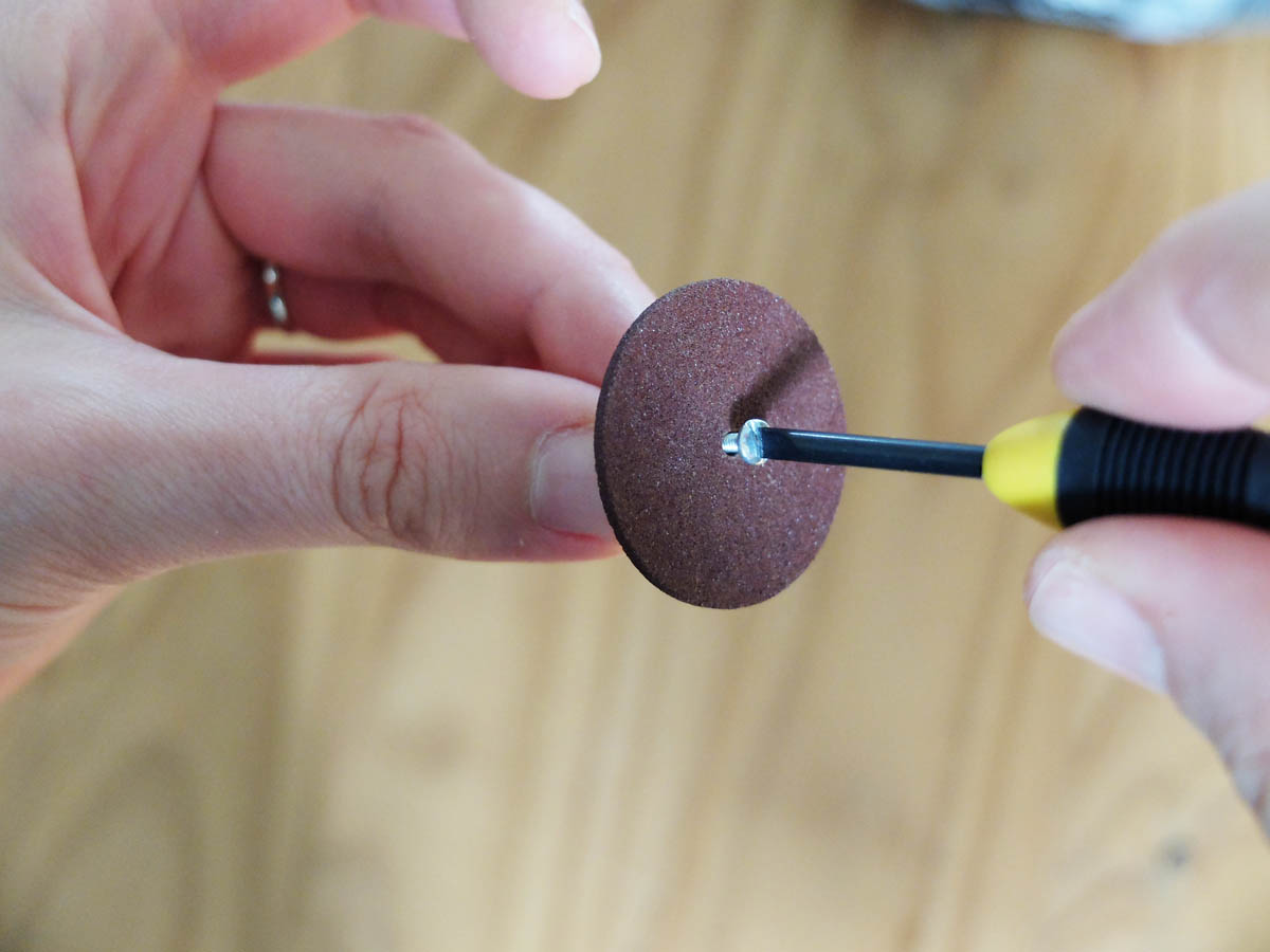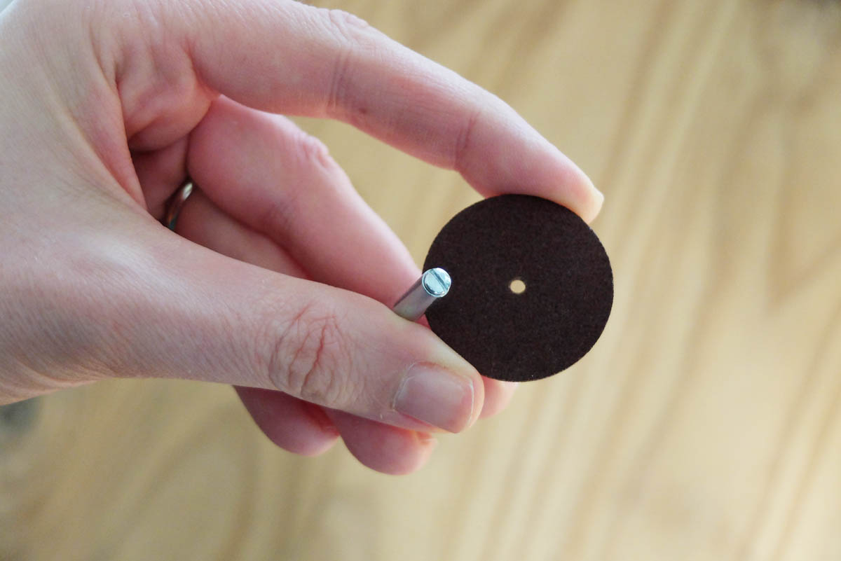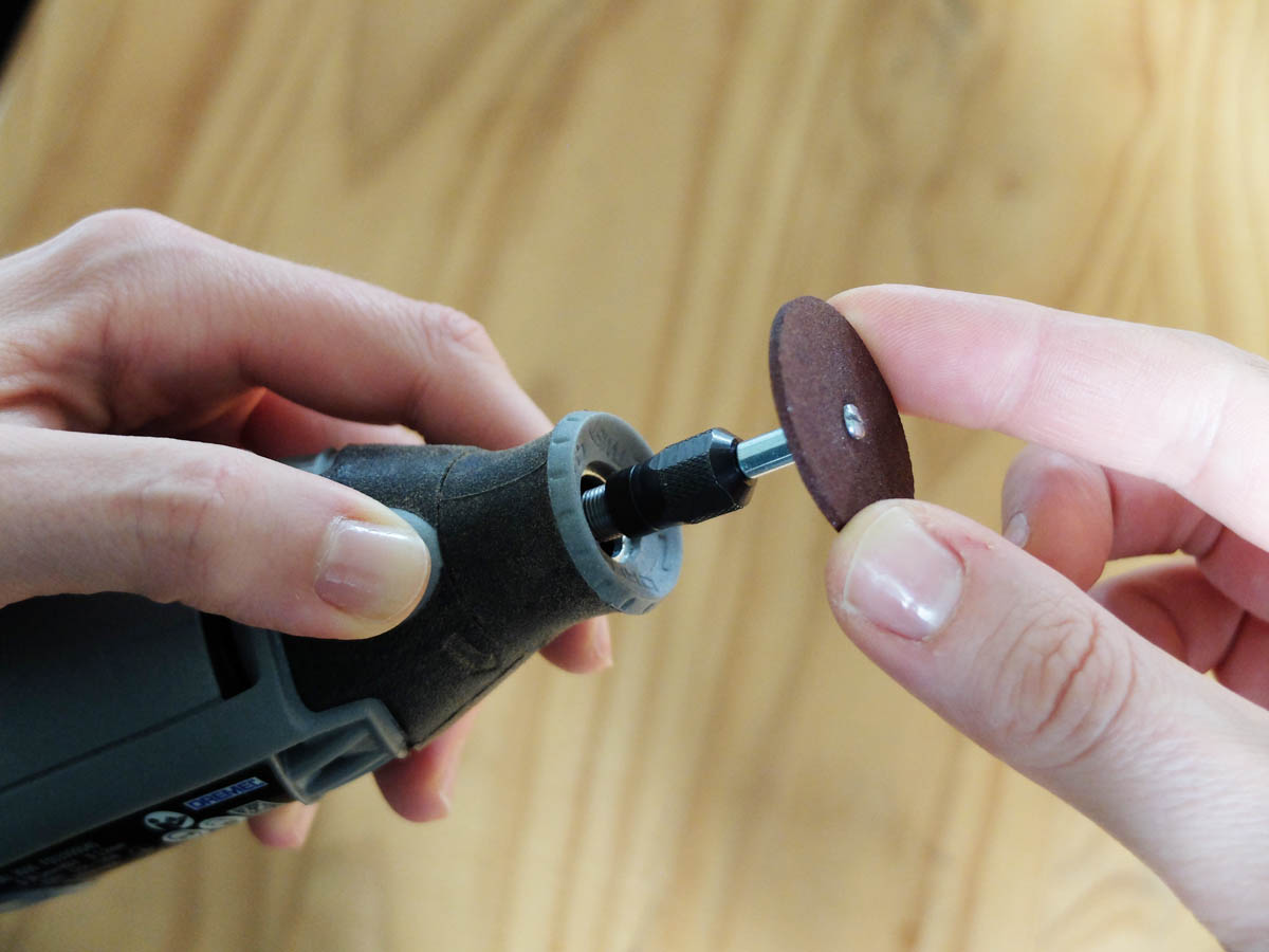 Commencez par fixer votre disque à tronçonner sur l’embout prévu à cet effet : ôtez la vis placée à l’extrémité de l’embout, insérez-la dans le disque puis revissez l’ensemble sur votre outil Dremel.