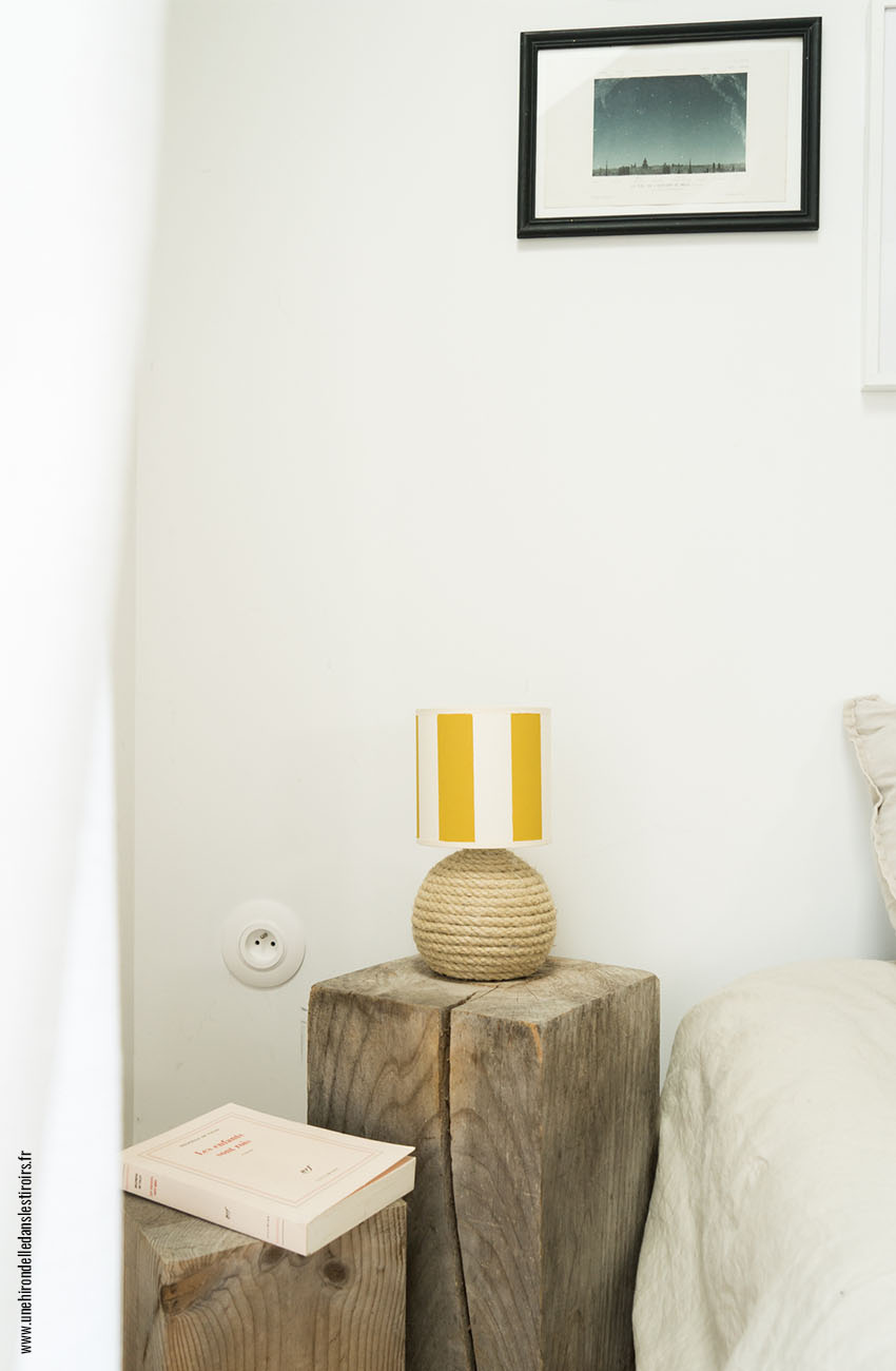 Je trouvais leur format parfait pour ma chambre d’amis sous les toits : il ne restait plus qu’à leur donner du style ! Pour cette pièce j’avais envie d’une touche très « bord de mer », quelque chose qui sente les vacances et le soleil. Et quoi de mieux qu’un pied en corde et un abat jour à rayures pour cela ?