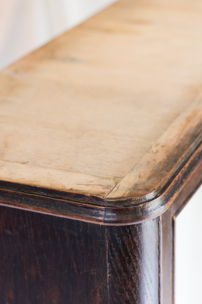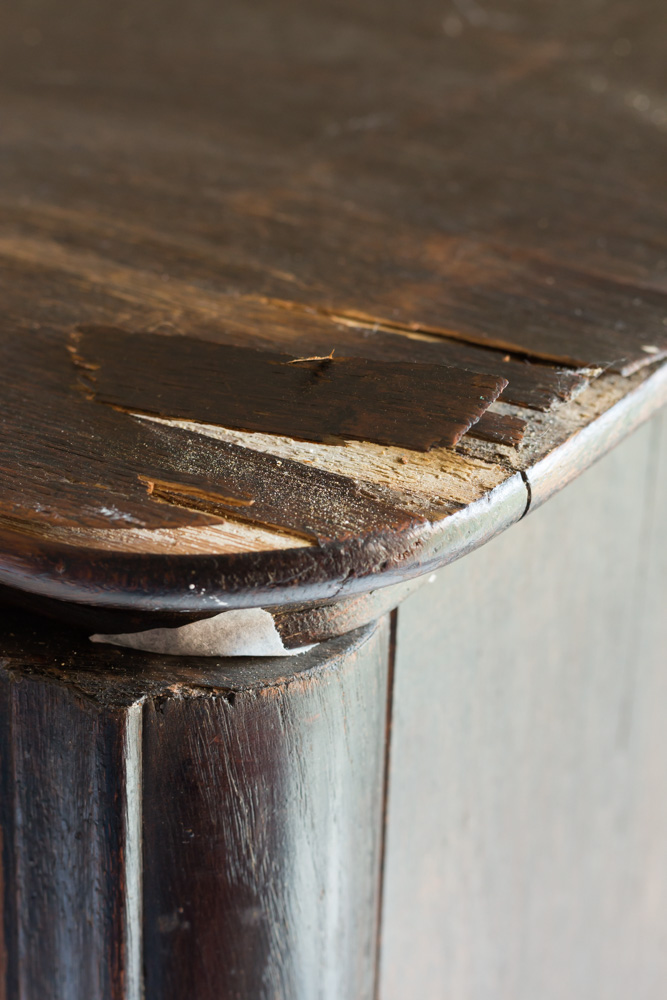 La vitrine était en bon état général, excepté sur le dessus. Le placage était en effet assez abîmé, gondolait et se décollait à de nombreux endroits. J’ai hésité à l’arracher et repeindre, mais je souhaitais garder la patine du bois dont j’aimais bien la couleur; j’ai donc décidé de le réparer au mieux.