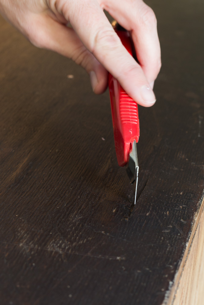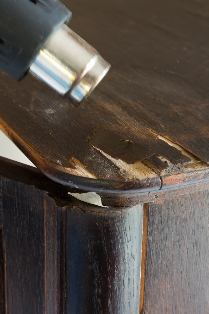 Le plaquage du dessus du meuble était très abîmé. Pour le recoller, j’ai procédé de deux manières : en soulevant les lames déjà décollées d’une main, j’ai appliqué la colle sur toute la surface concernée avec un pinceau. Pour les cloques, je les ai « ouvertes » avec un cutter, pour pouvoir ensuite y glisser la colle à l’aide d’une petite spatule. Je me suis aidé dans ces opérations du décapeur thermique, afin de rendre le bois plus « souple ». J’ai ensuite posé des serres-joints ou des objets lourds sur les parties recollées le temps du séchage.