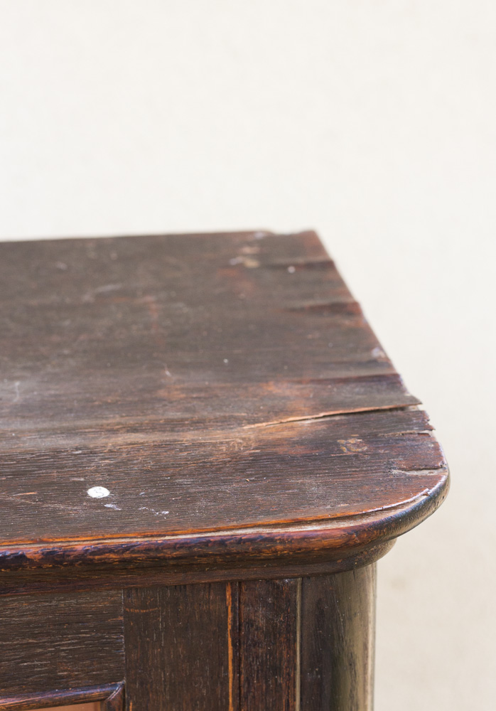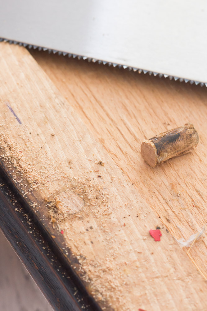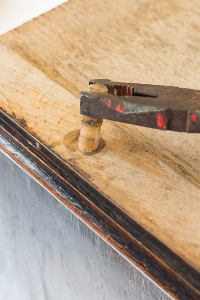 J’ai ensuite retourné le meuble, en le posant sur le dessus, pour pouvoir travailler correctement. Le dessous était en bon état, mais il présentait deux tourillons qui servaient à le solidariser avec la partie basse du meuble. J’ai réussi à retirer le premier à l’aide d’une pince, en faisant des mouvements de droite à gauche. Le second était lui complètement collé, j’ai donc utilisé une petite scie à main pour couper à fleur du reste du meuble.