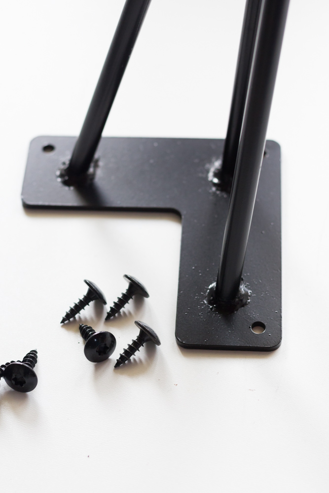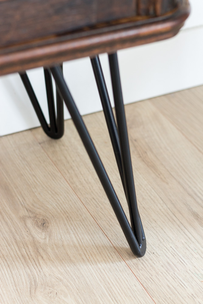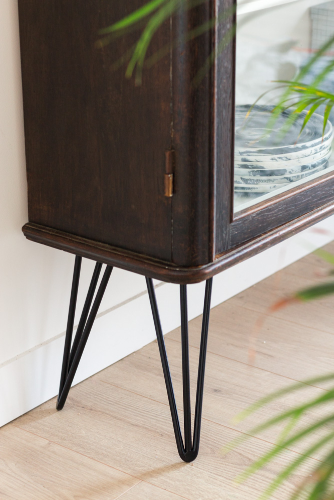 Pour les pieds, j’ai choisi des pieds « épingle renforcé ». Je trouvais leur design parfait pour apporter de la légèreté à ma vitrine, et leurs dimensions offraient également l’avantage de s’adapter à la faible profondeur du meuble. J’ai choisi une hauteur de 30 cm, et un coloris noir. Avec les pieds, j’ai également reçu des vis pentures, qui correspondent à la platine et permettent de les fixer très solidement.