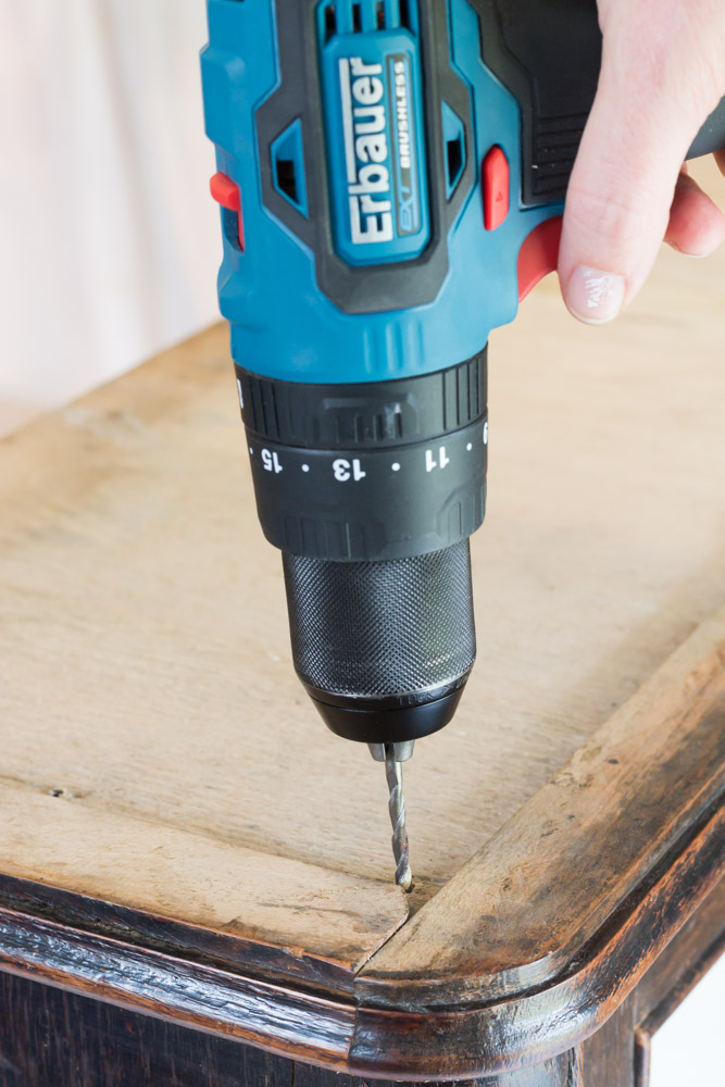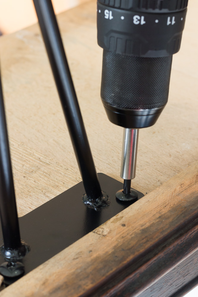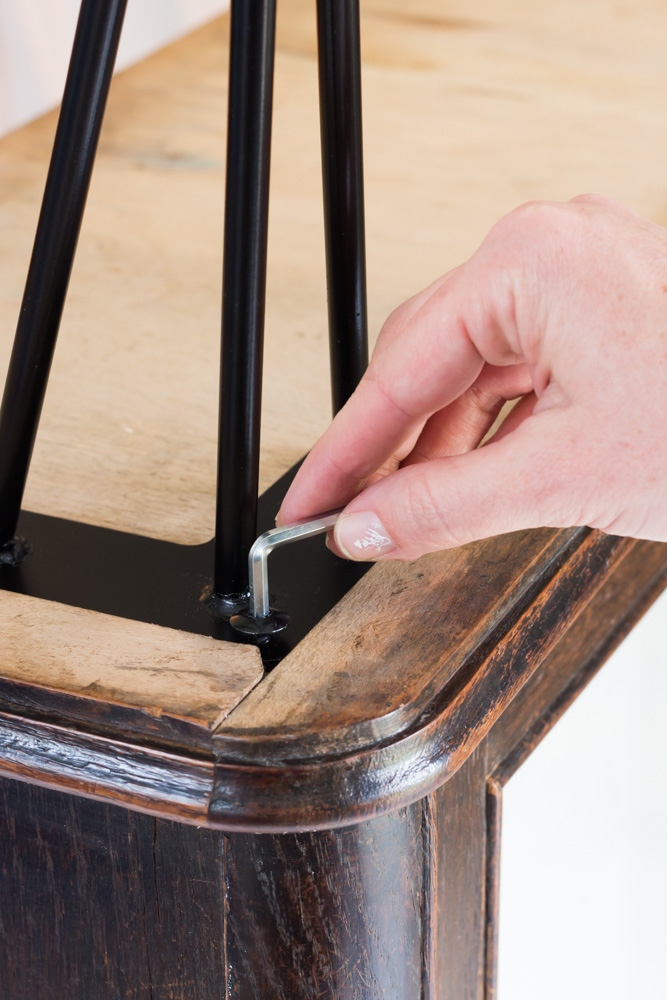 Les pieds que j’ai choisi étant inclinés vers l’extérieur, il faut utiliser une clef Allen pour serrer la vis à l’angle. J’ai donc pré-percé le bois (avec une mèche de 4 mm) avant de visser.