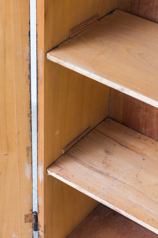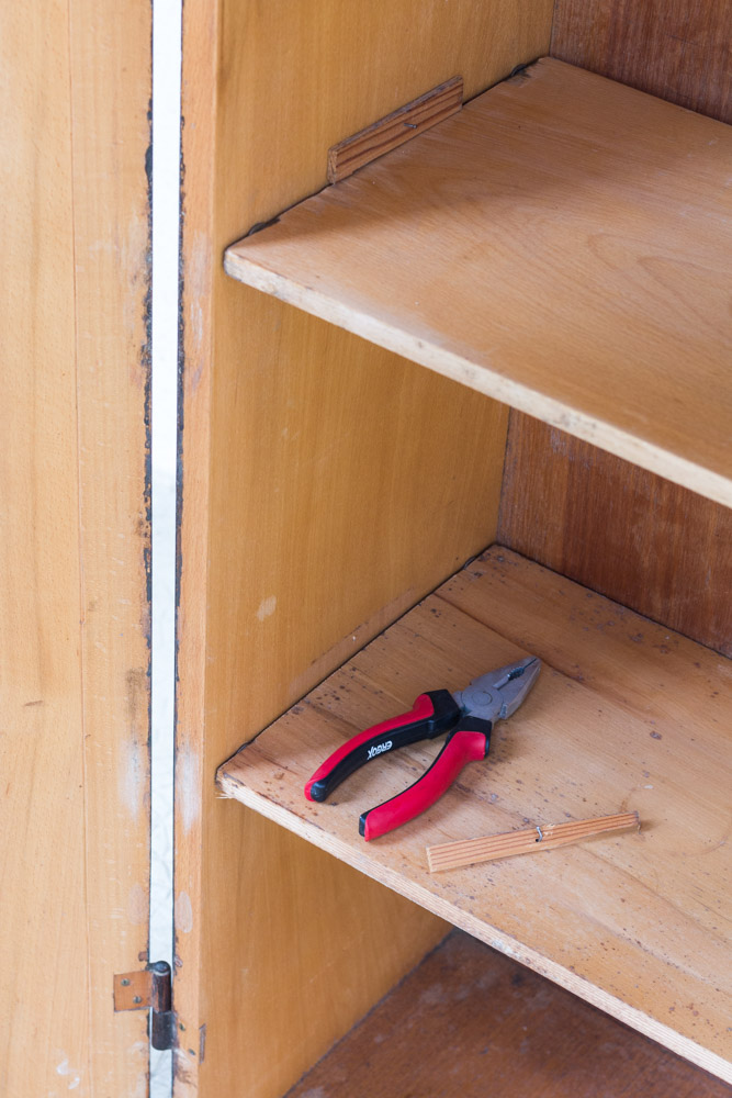 J’ai commencé par démonter ce qui pouvait l’être, pour pouvoir travailler plus facilement. A l’aide d’une pince, j’ai ôte les taquets qui bloquaient les étagères pour pouvoir ensuite les retirer, ainsi que les équerres d’étagère. J’ai également retiré les petits clous qui dépassaient, et nettoyé l’ensemble du meuble. Je n’avais pas ici la possibilité d’enlever les portes, mais je vous conseille de le faire si vous le pouvez pour plus de facilité à travailler.