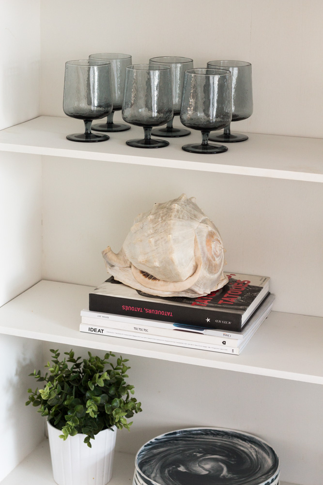 Avant de peindre l’intérieur de ma vitrine, j’ai appliqué une sous-couche spéciale surface lisse (type stratifié, carrelage, etc). En effet, le vernis de mon meuble était plutôt résistant au ponçage, j’ai donc opté pour cette solution. Pour peindre proprement les montants des vitres, voici mon astuce : je prend une spatule en métal, je la pose contre le bord, comme sur la photo (si il y a un espace entre la vitre et le bois, insérer la spatule dedans). Je n’ai plus ensuite qu’à peindre le bois à l’aide d’un petit pinceau. Veillez à ne pas trop charger votre pinceau et à essuyer très régulièrement la spatule. Vous trouverez dans cet article toutes mes astuces pour rénover un meuble !