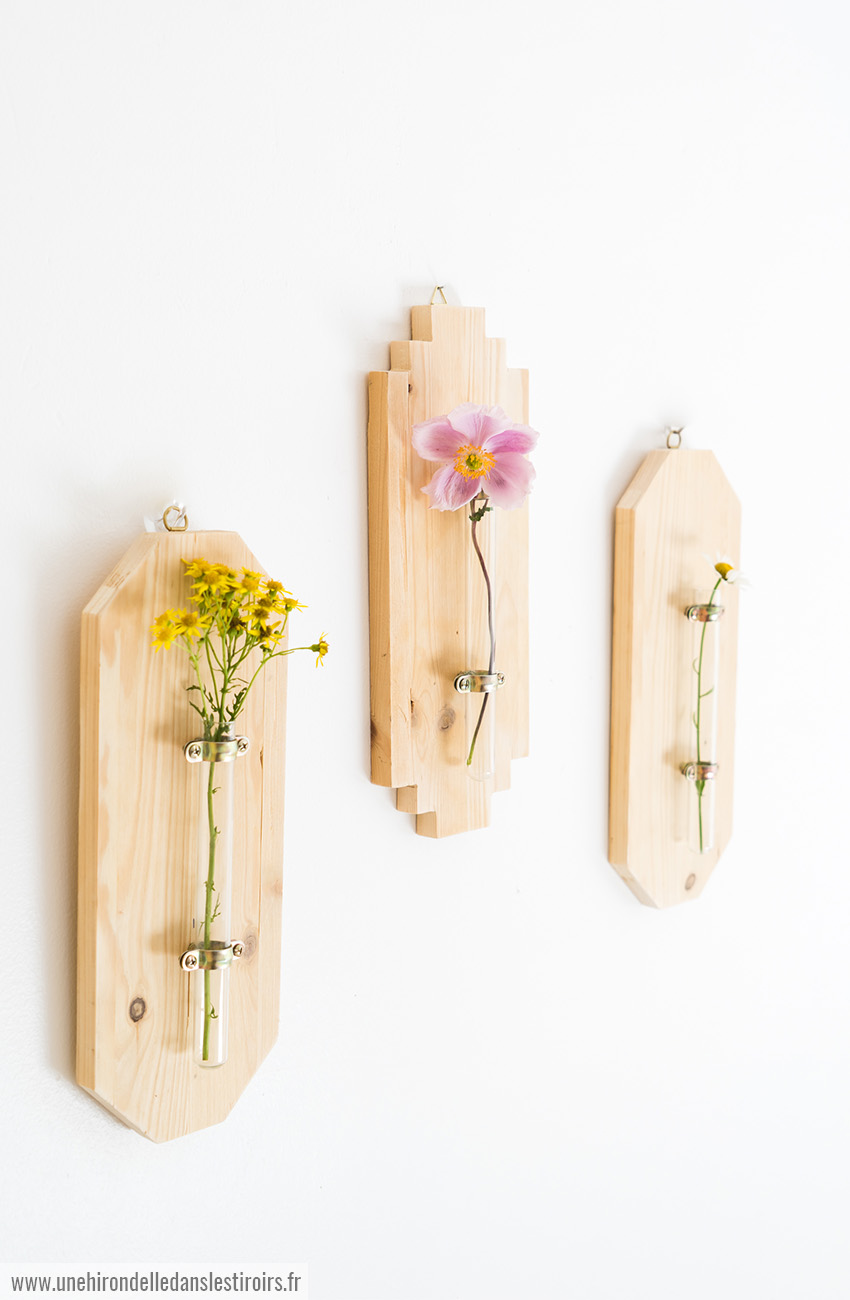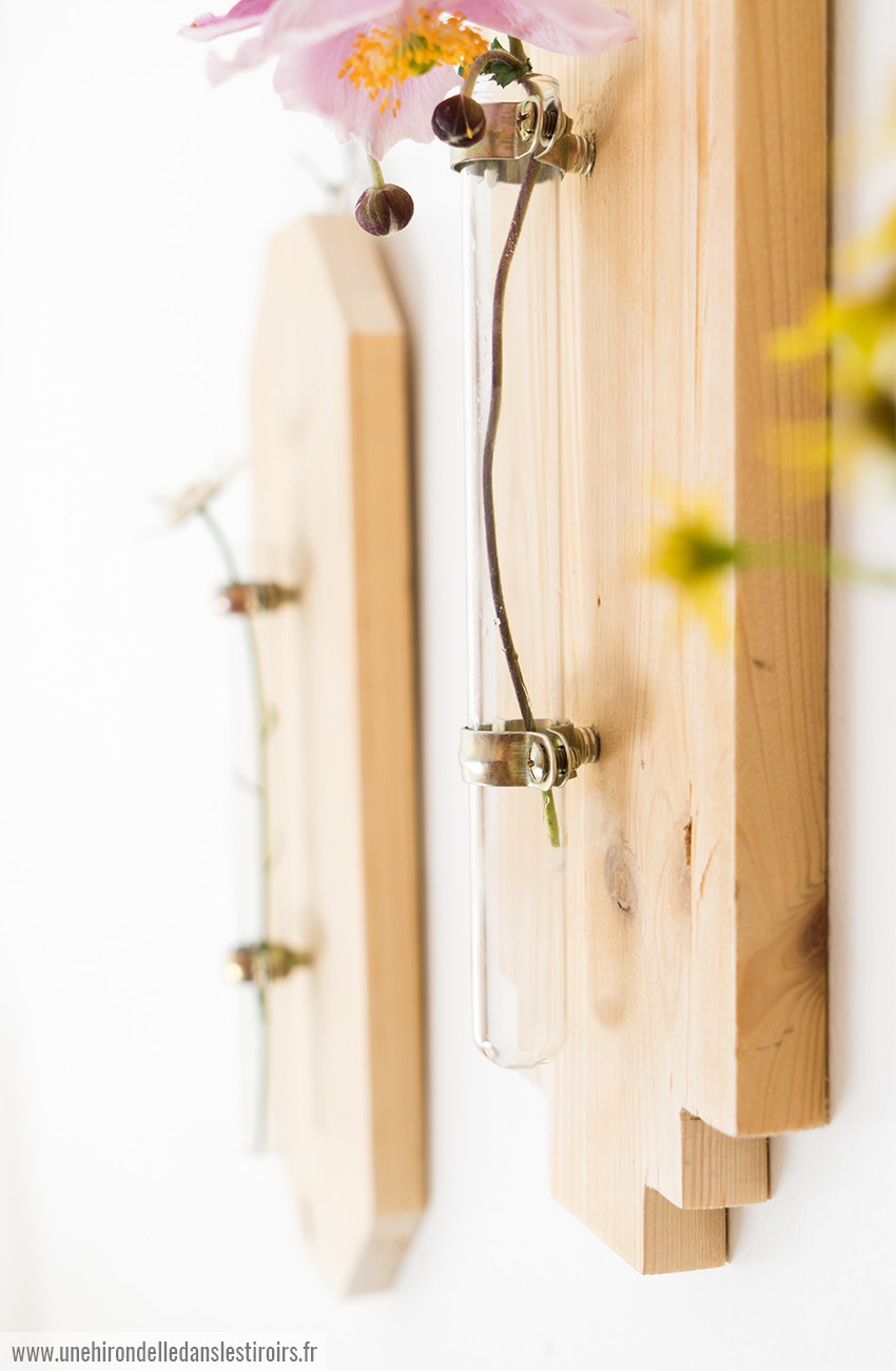 J’ai réalisé un triptique : deux soliflores dont j’ai simplement « cassé » les angles, et le troisième dans lequel je suis venue découper des formes en escalier. C’est ultra rapide à faire, au final le plus long pour moi a été de rechercher quelle quincaillerie pourrait me permettre de réaliser mon idée ! Je souhaitais en effet que l’éprouvette puisse se retirer et se replacer facilement pour pouvoir la remplir et changer l’eau sans difficultés. Pour les détails à ce sujet et les étapes de fabrication, rendez-vous comme d’habitude sur 18h39 ;) Et pour les éprouvettes, j’ai trouvé celles au diamètre que je souhaitais ICI .