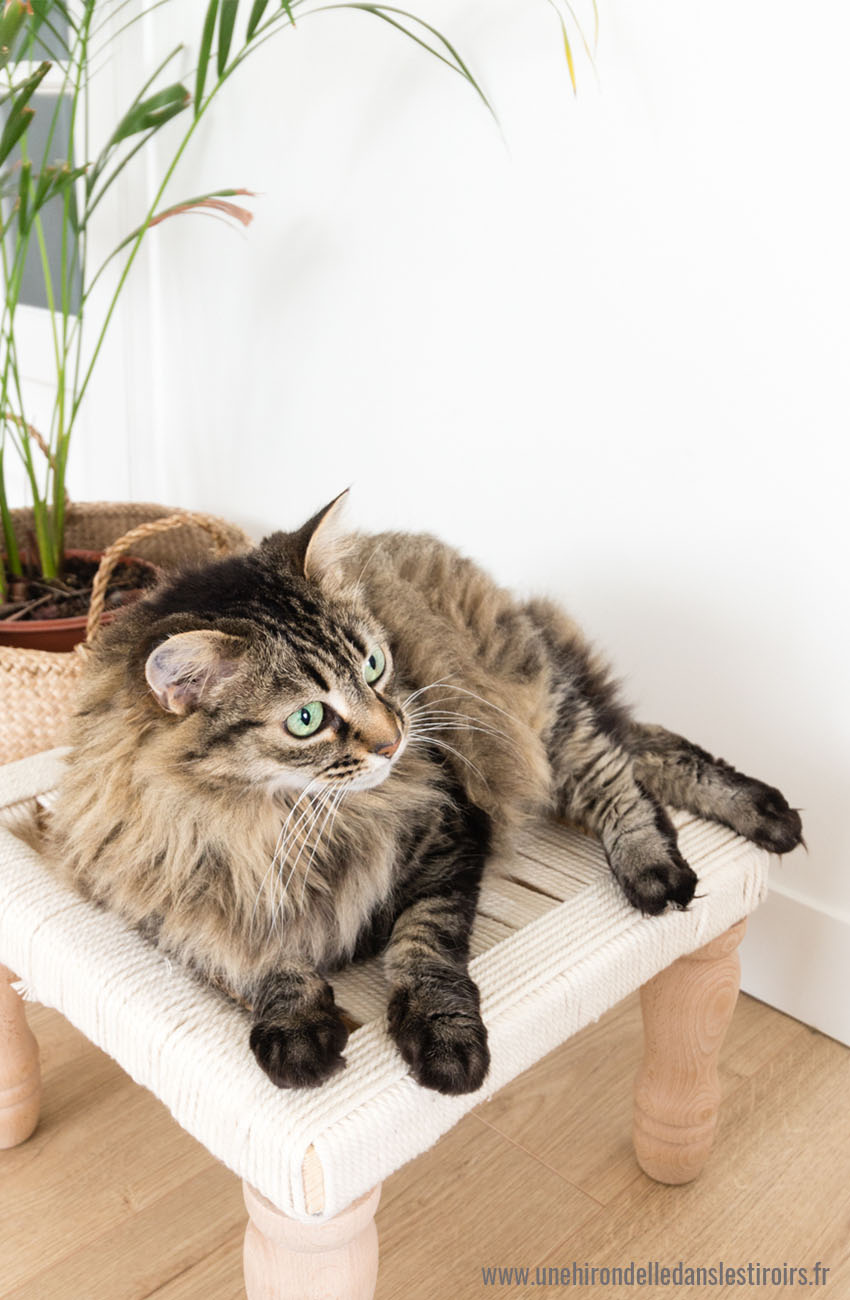 J’adore le résultat, qui apporte une jolie touche bohème dans une pièce je trouve. On peut s’en servir comme assise d’appoint, mais également comme repose-pieds, ou encore comme petite table pour poser un plateau par exemple, etc. Attention, si vous avez des chats, il y a de grandes chances qu’ils l’adoptent et l’accaparent. Kami l’avait à l’époque testé et approuvé et adorait s’y installer !