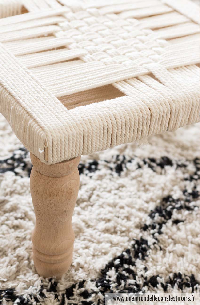 Pour la réalisation, j’ai donc confectionné un cadre, puis j’ai réalisé mon tressage avant de fixer les pieds. Vous pouvez retrouver le pas à pas de ce DIY tabouret bohème sur 18h39 avec les explications détaillées.