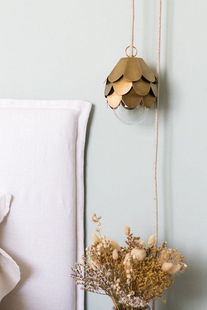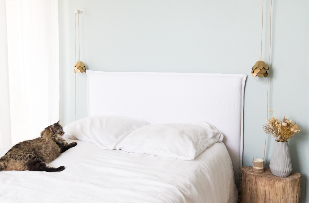 A mon arrivée ici, j’ai tout de suite su quelle atmosphère je souhaitais pour la chambre. Contrairement à celle de mon ancien appartement nantais, la pièce ici est assez petite, et se prête donc parfaitement à l’ambiance douce et cosy dont j’avais envie ! L’ingrédient incontournable pour une chambre cocooning, c’est selon moi une tête de lit : en inconditionnelle du DIY, j’ai décidé de la fabriquer !