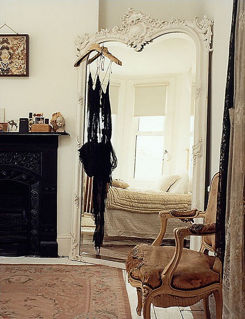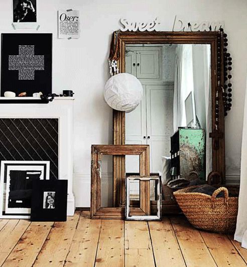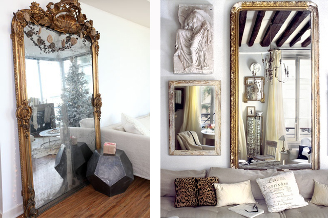 J’adore l’effet d’un grand miroir posé à même le sol et montant jusqu’au plafond comme sur la première photo, et l’association avec un miroir plus petit sur la second.