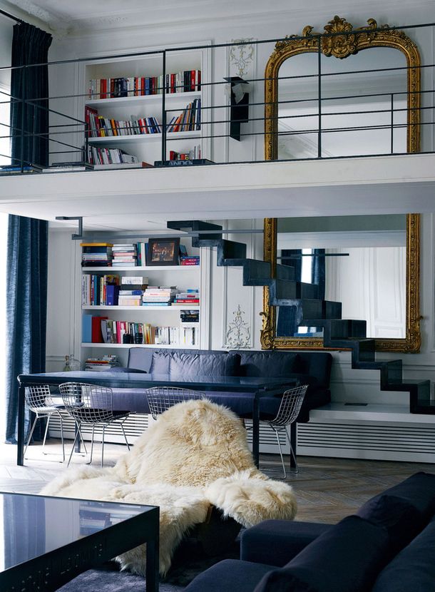 Ce (très) grand miroir ancien d’une taille assez incroyable est utilisé d’une façon très originale : couvrant la pièce mais aussi sa mezzanine, il met en avant les volumes de façon superbe !