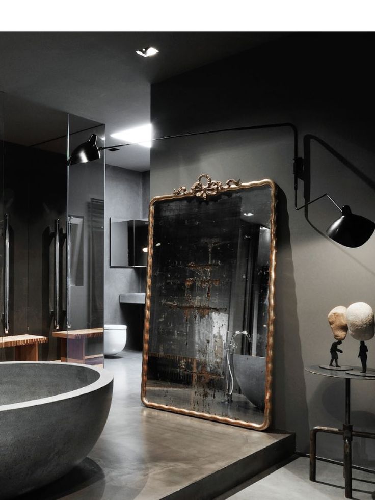 On hésite pas à mélanger les styles : dans une salle de bain moderne à la dominante de béton ciré, j’adore l’effet que vient donner ce grand miroir ancien mercurisé !