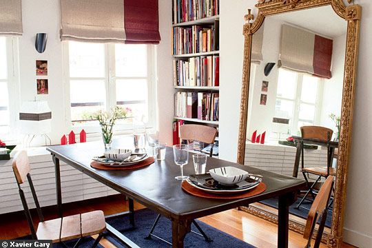Un grand miroir ancien est aussi une idée déco à retenir pour les petits espaces, comme ici dans cette salle à manger.