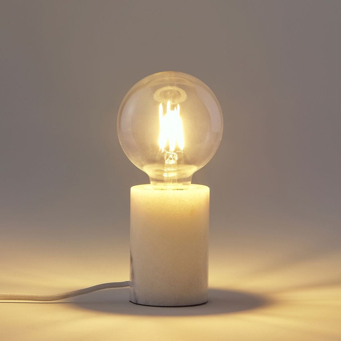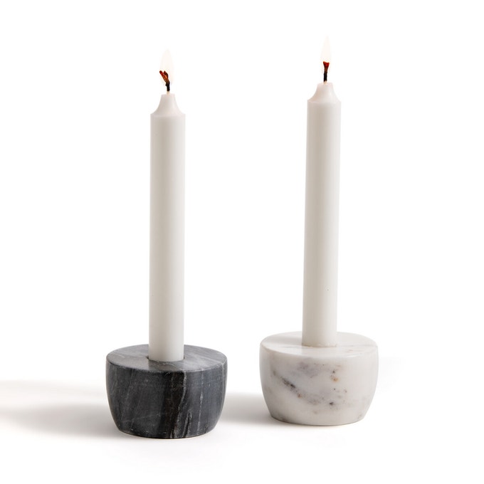 Lampe à poser en marbre 36.03 € / Lot de 2 bougeoirs en marbre, 19.99 € / Duo miroirs ronds laiton, 15.99 €