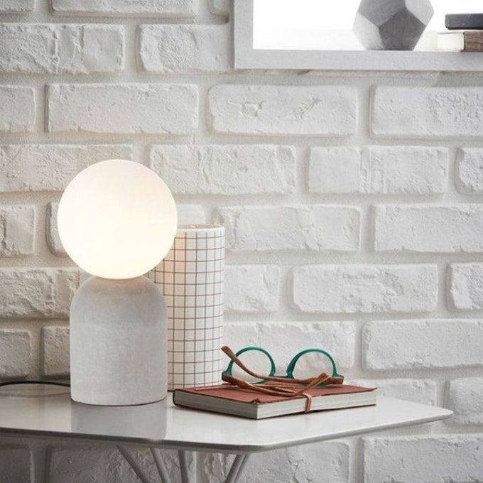 Lampe à poser béton, 40.07 € / Trio de cadres ronds laiton, 19.99 €