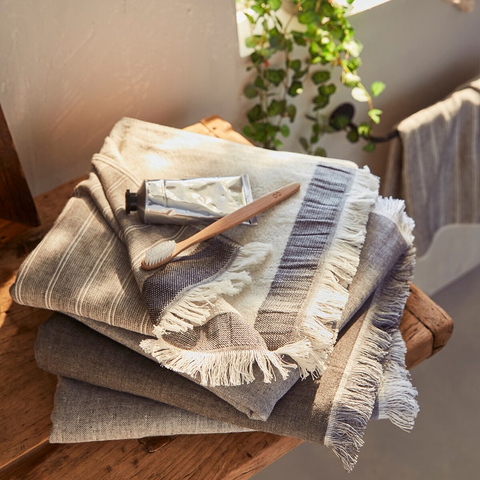 Grand drap de bain en coton biologique, 31.20 € / Maxi drap de bain rayé, dispo en 6 couleurs, 17.49 € / Plaid aspect mohair grand carreaux, 39.99 €