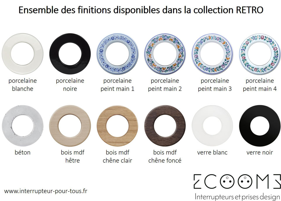 Si vous affectionnez les interrupteurs design au look rétro, la collection éponyme de la marque revisite le style tout en rondeur des années 30. ECOOME propose des boutons travaillés que je trouve particulièrement réussis, tant dans leurs formes que dans leurs coloris et patines. La gamme des plaques de finition de cette collection est quant à elle particulièrement fournie, allant de la porcelaine peinte à la main au béton, en passant par le bois. On est, de mon point de vue, pas loin de l’objet d’art !
