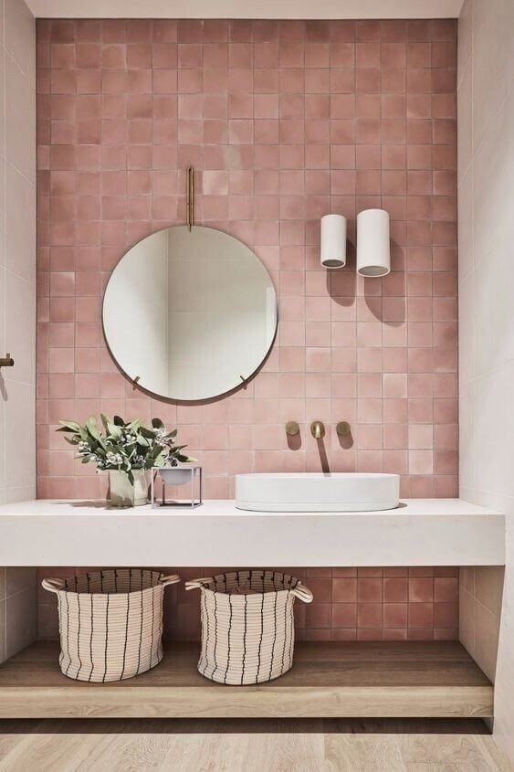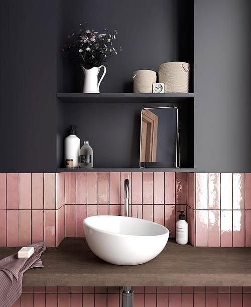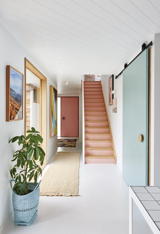 Pour habiller les murs de roses, vous avez l’embarras du choix : peinture bien-sûr, mais aussi papier peint, ou encore faïence pour jouer avec la lumière. Autre idée, opter pour les portes roses, ou même pourquoi pas peindre l’escalier !