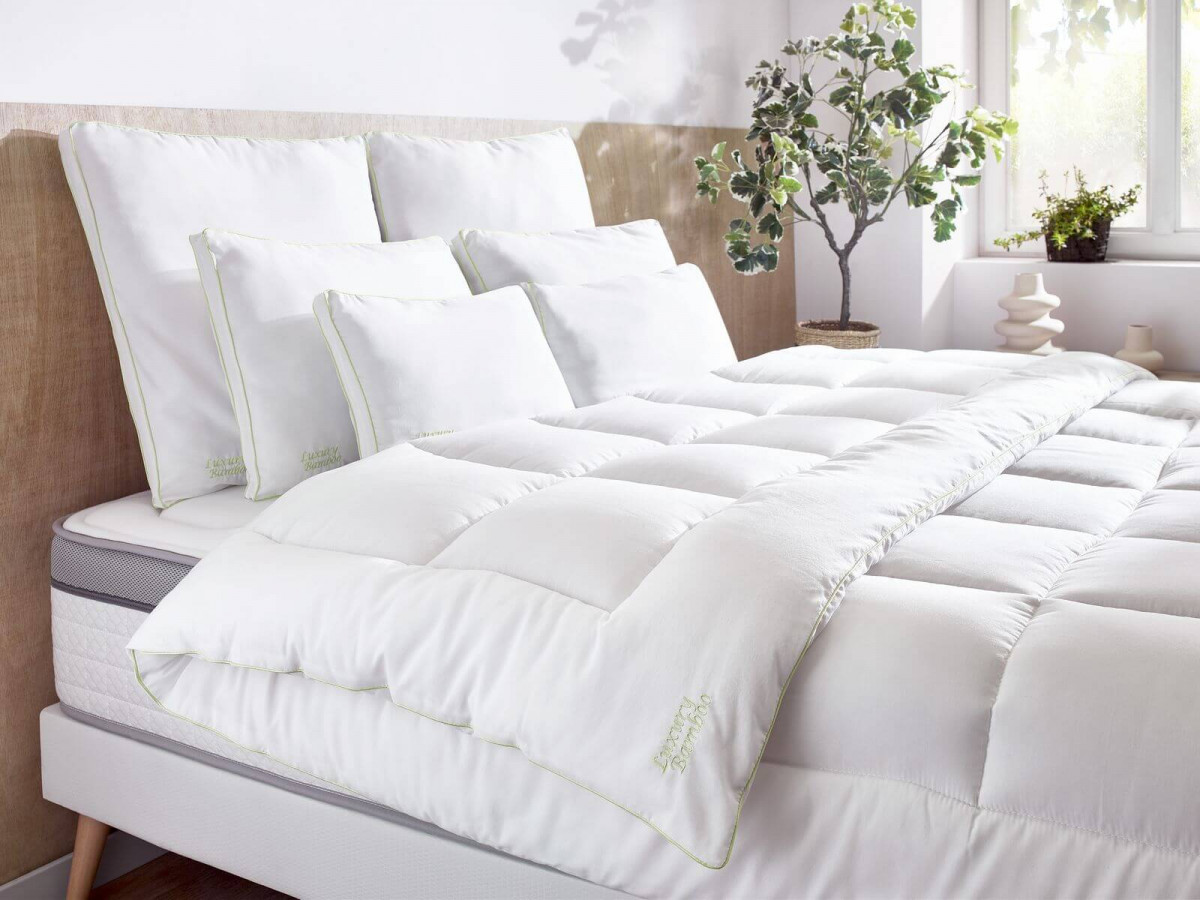 Fauteuil accoudoirs cannage /Table d’appoint métal / Tête de lit imprimée / Couette en bambou thermorégulatrice