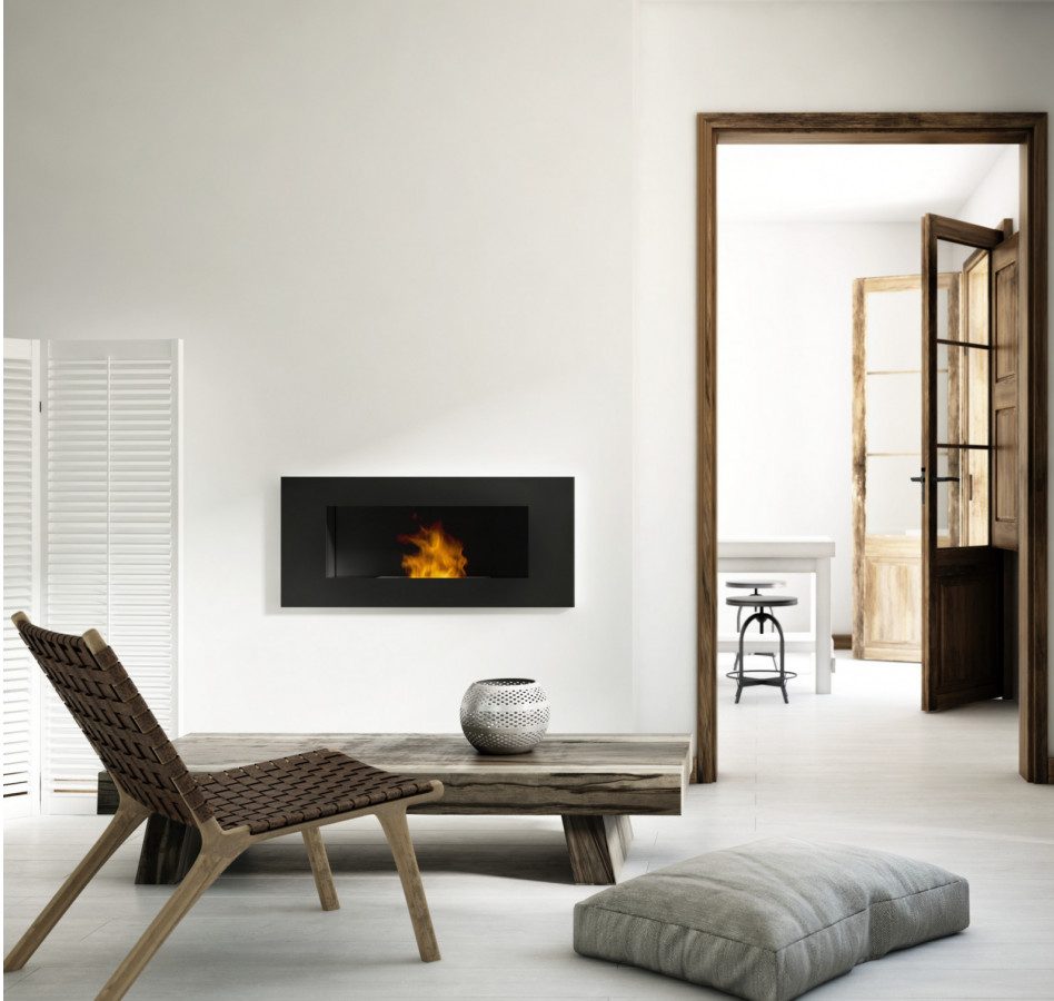 Fauteuil gris / Miroir en bois recyclé / Cheminée murale bioéthanol / Tapis oriental