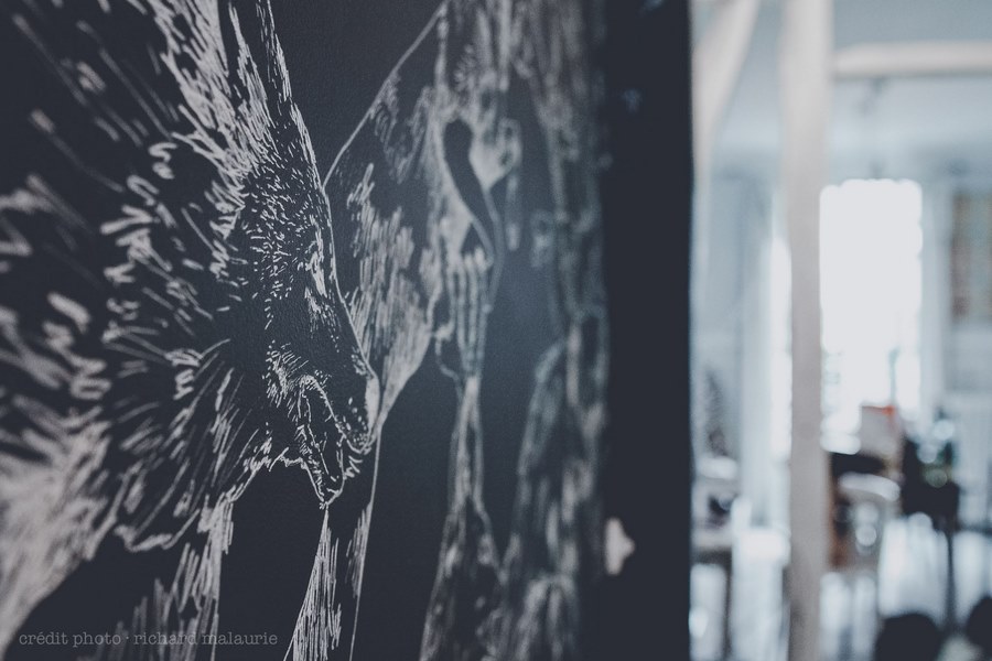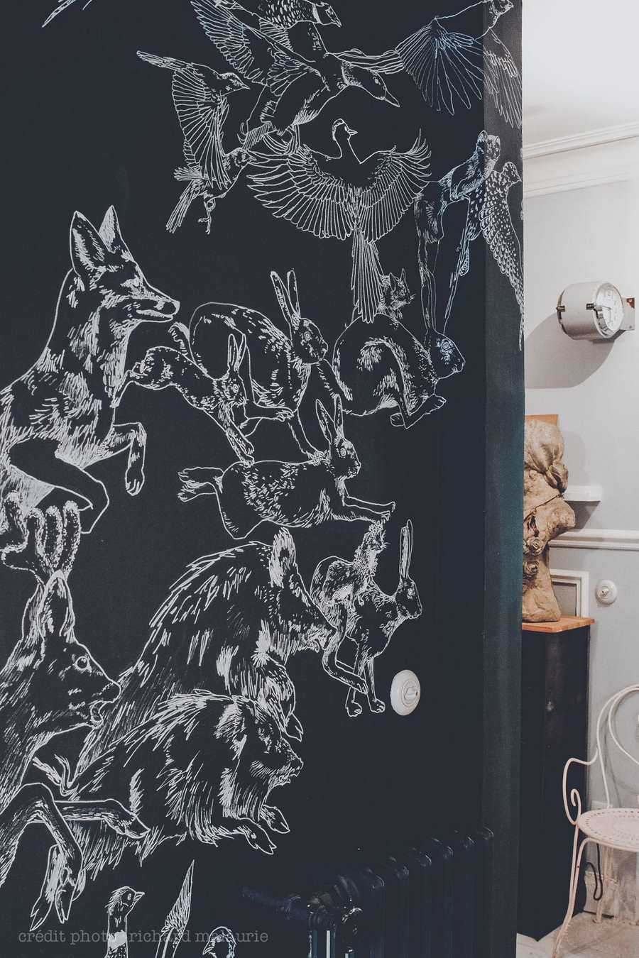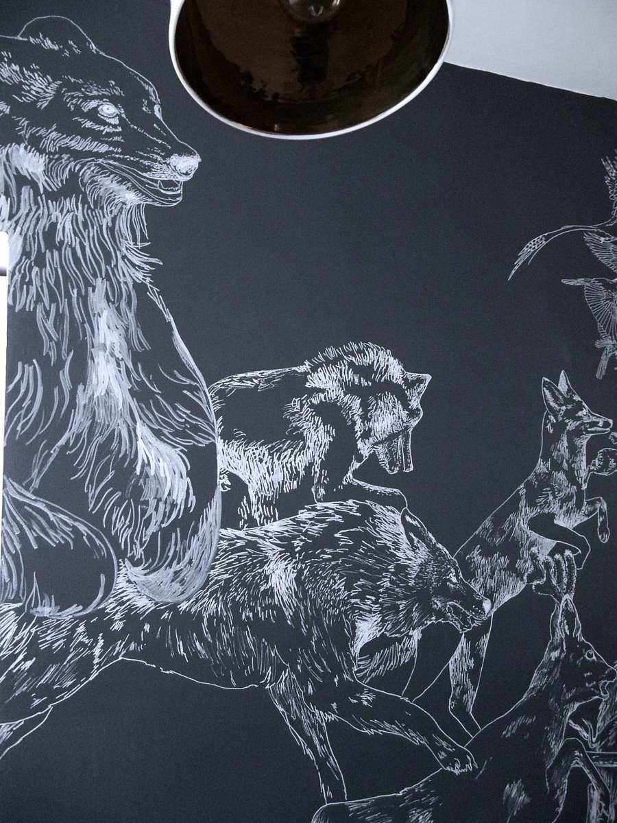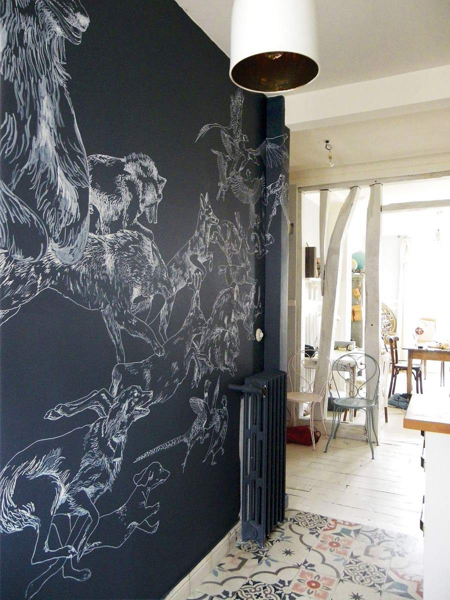 Waouh! Je ne connaissais pas du tout et j’avoue qu’avant de voir les photos, je pensais que c’était des sortes de « stickers » géants haut-de-gamme… Vraiment impressionnée de voir qu’ils réalisent cela à la main, directement sur le site concerné. Talent en vue, je suis conquise ! Bon, je ne raffole tout de même pas du thème de la chasse, mais le rendu des loups dessiné en blanc sur ce mur noir est vraiment élégant.