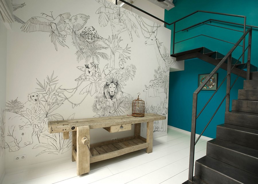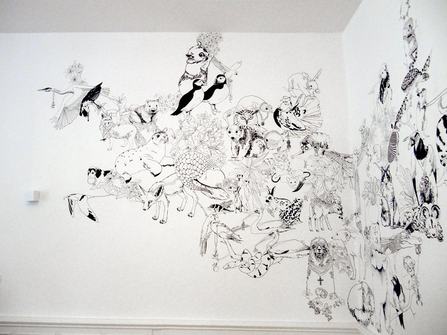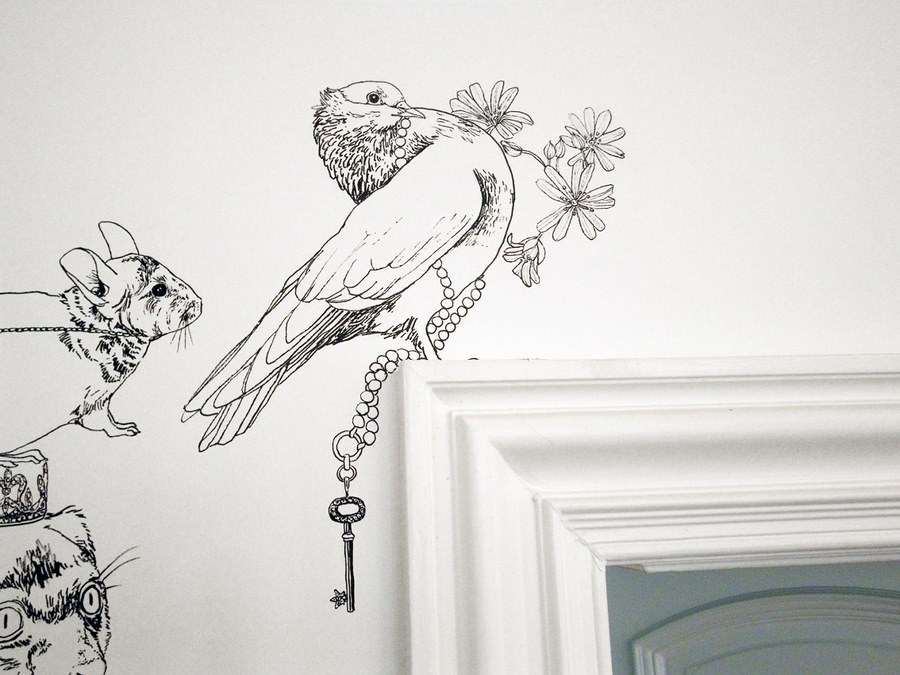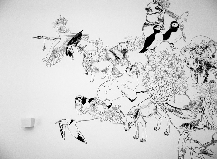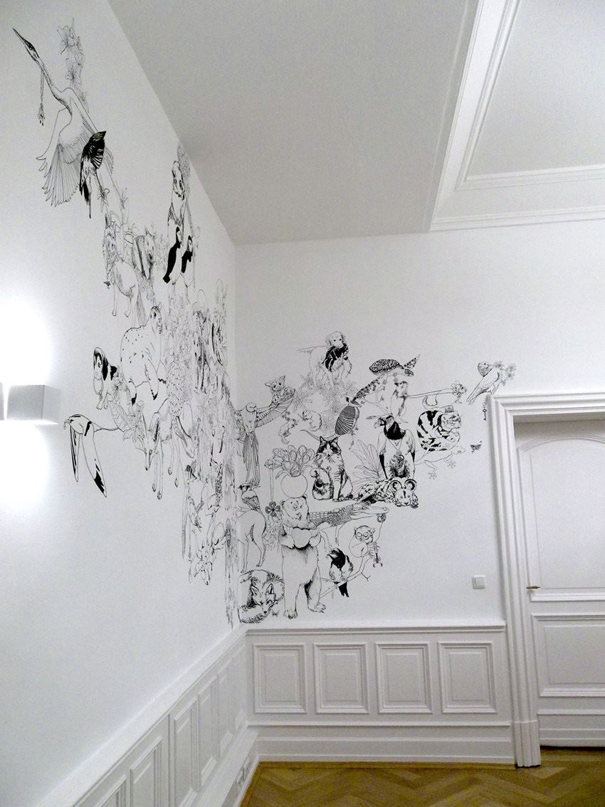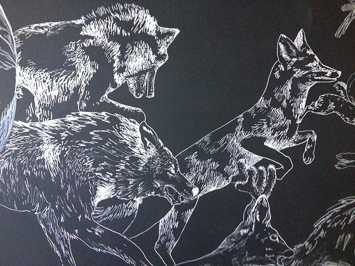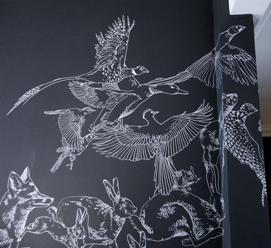 Waouh! Je ne connaissais pas du tout et j’avoue qu’avant de voir les photos, je pensais que c’était des sortes de « stickers » géants haut-de-gamme… Vraiment impressionnée de voir qu’ils réalisent cela à la main, directement sur le site concerné. Talent en vue, je suis conquise ! Bon, je ne raffole tout de même pas du thème de la chasse, mais le rendu des loups dessiné en blanc sur ce mur noir est vraiment élégant.
