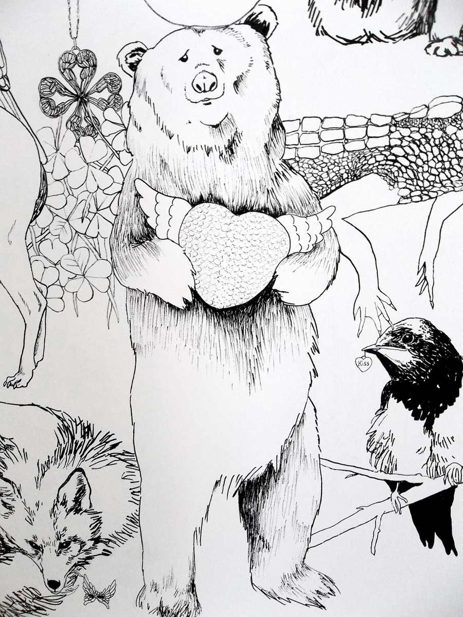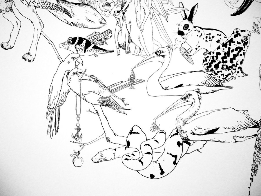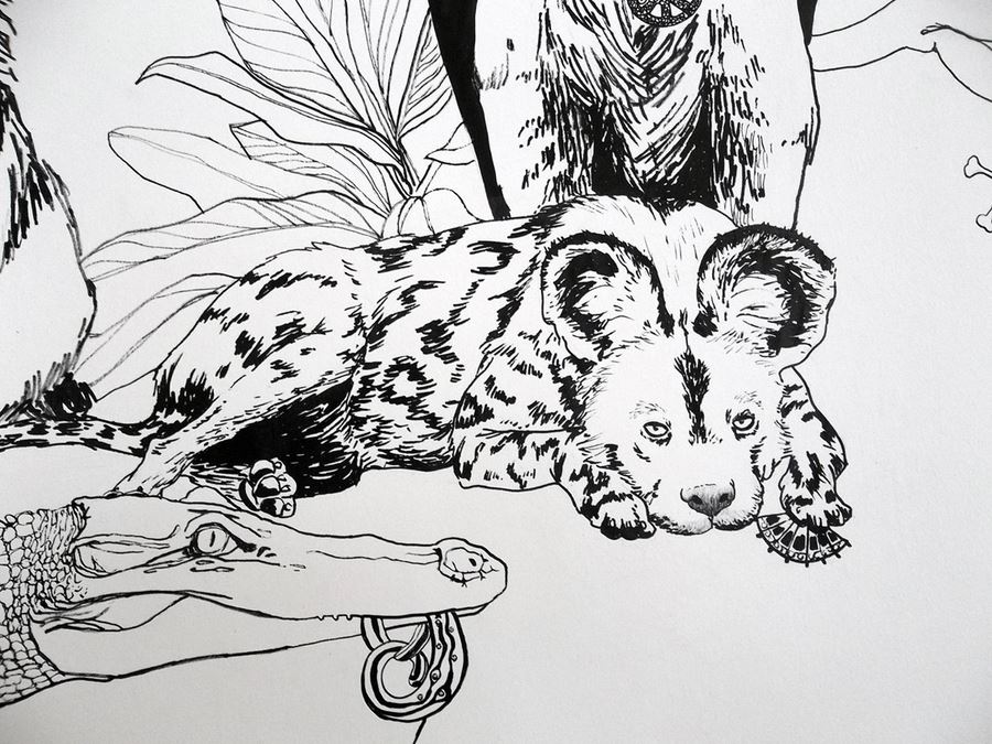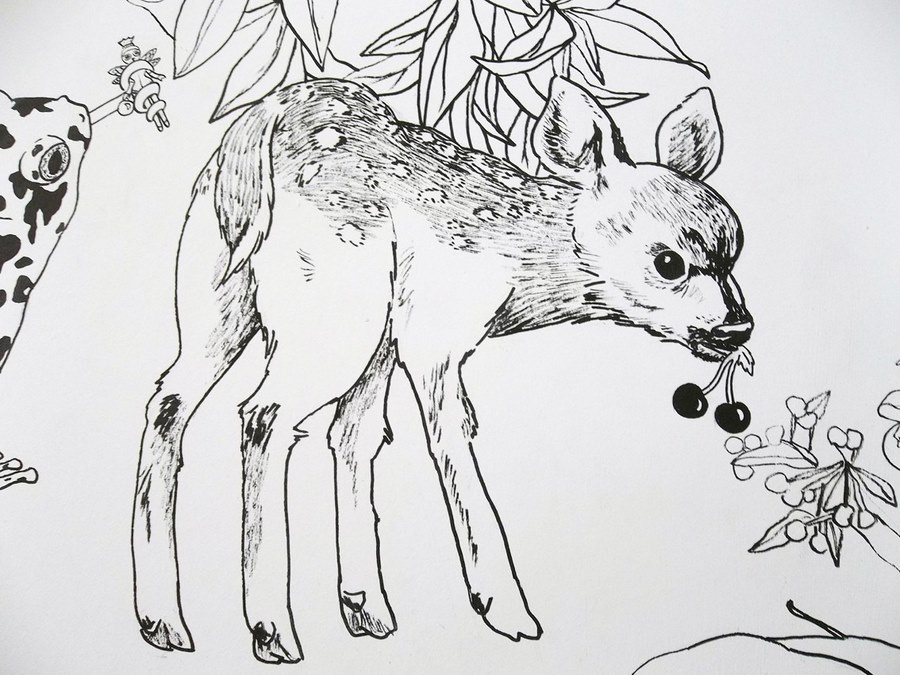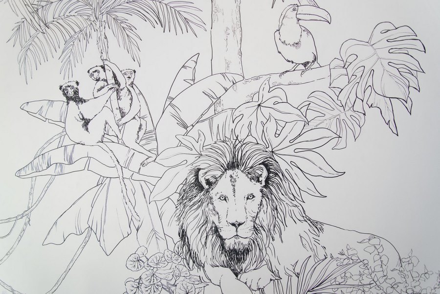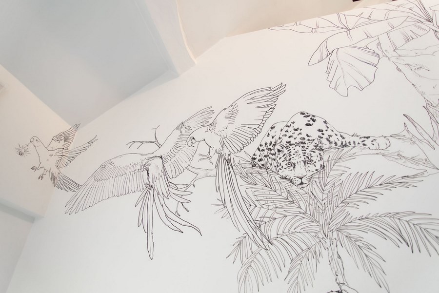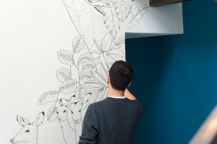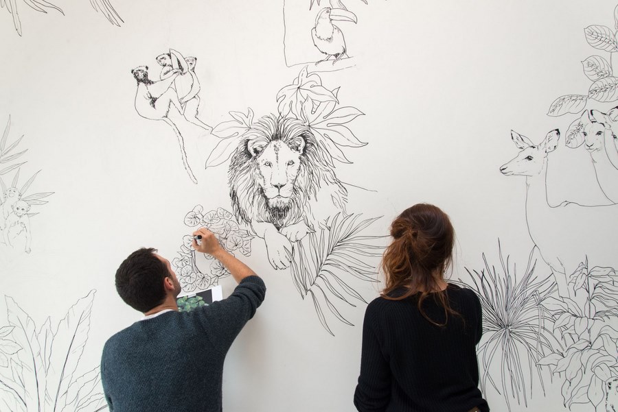 Caddous&Alvarez est un studio de création graphique qui réalise des fresques mais aussi des imprimés textiles et papiers peints. Cécile Alvarez et Hugo Caddous créent des fresques murales où se mêlent faune et flore, des décors oniriques et réalistes à la fois, dessinés à 4 mains à même le mur au posca. Les illustrations des deux artistes s’entrecroisent et s’allient pour donner vie à une histoire pleine de poésie, chaque fois différente. Les animaux s’y côtoient de manière parfois improbable, envahissent les lieux et débordent sur les angles des murs.