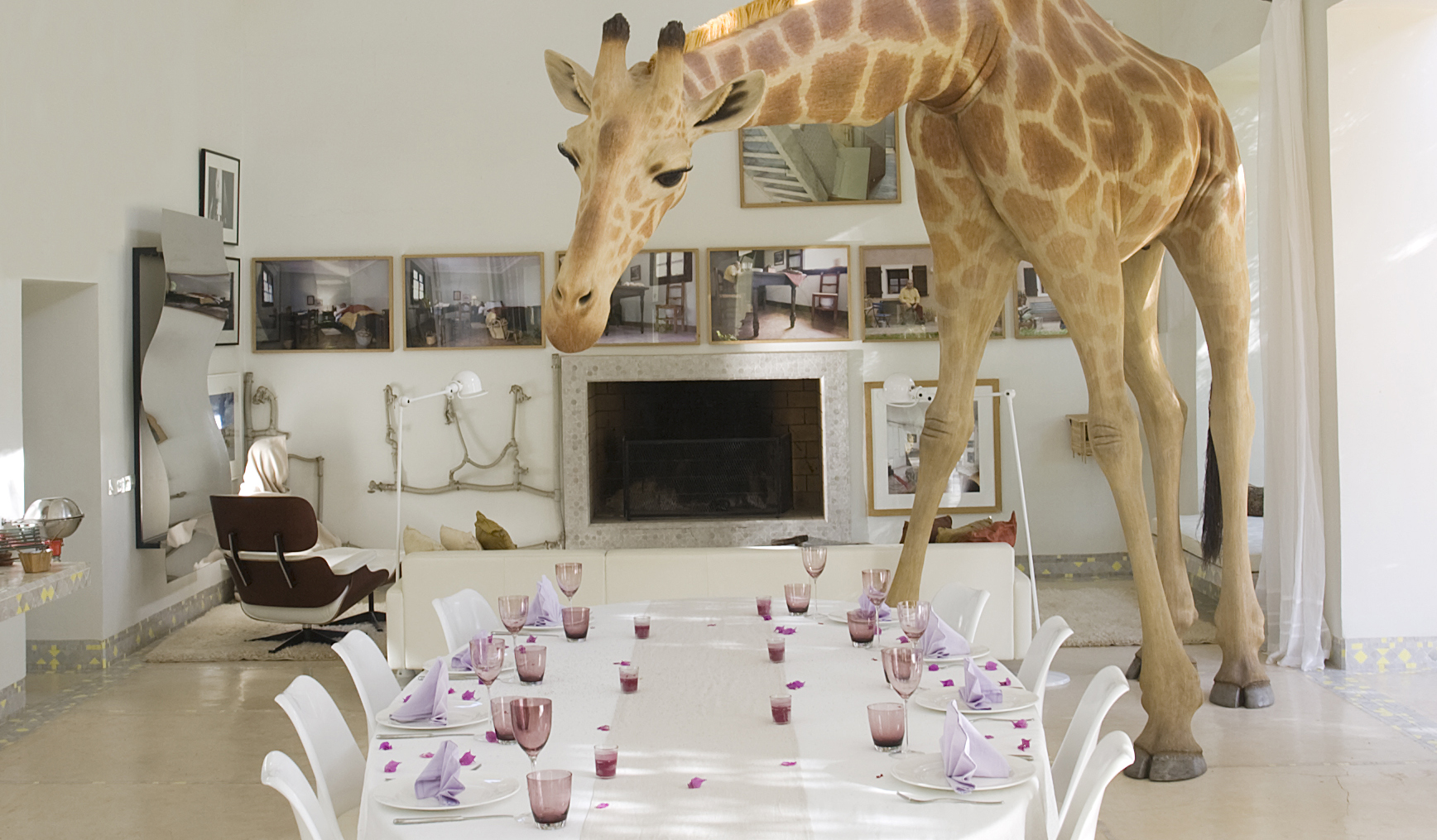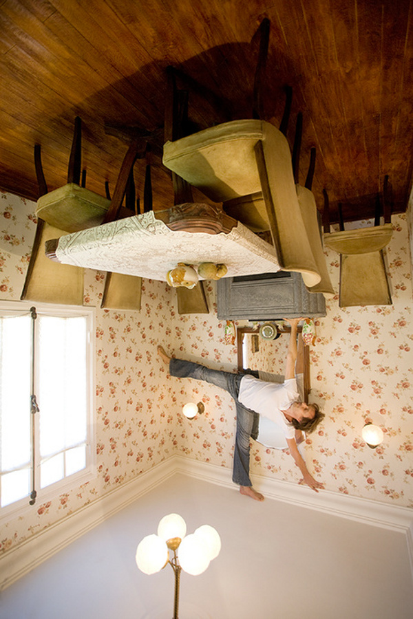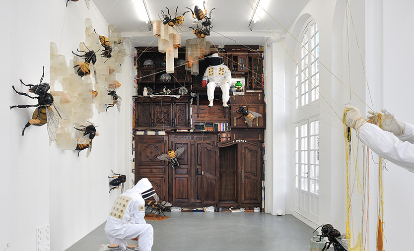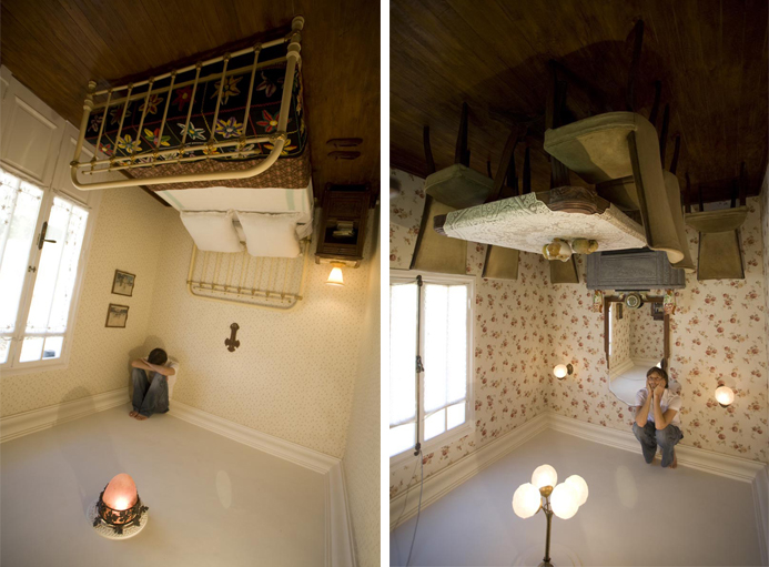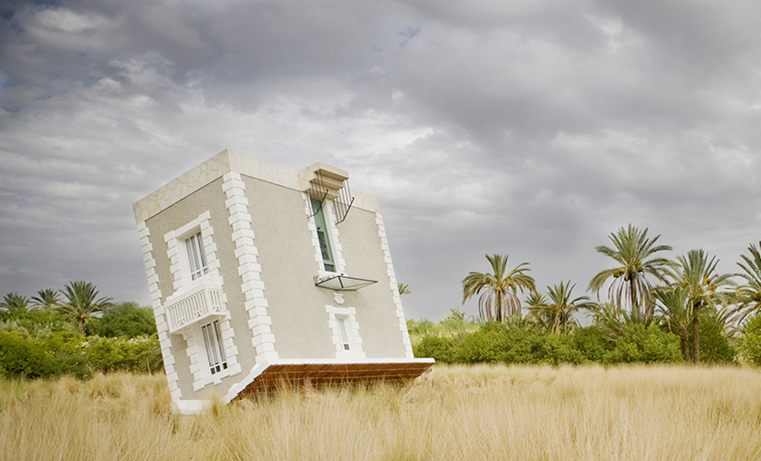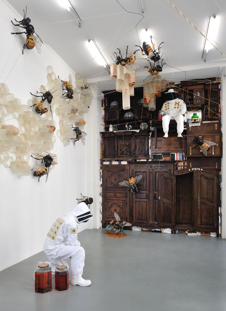 Jean François Fourtou créé des maisons à la fois fantasques et intimistes. Ce sont trois d’entre elles que je vous propose de découvrir aujourd’hui : une maison renversante, construire à l’envers et inclinée, une maison à l’échelle de celle d’une poupée dans laquelle se recroqueviller, ou encore une maison ruche, butinée par ces abeilles incroyables, dans laquelle s’invite une girafe. Le travail de l’artiste distord les proportions et les perceptions. Au travers de ces lieux, c’est son monde intérieur dans lequel il nous invite, entre souvenirs et rêves, aux portes de l’enfance et de l’onirique.