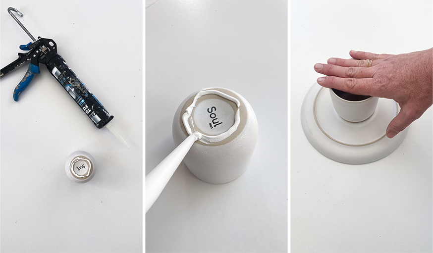 Je souhaitais donc des centres de table qui apportent un peu de hauteur et de relief à ma table. Pour les réaliser, j’ai simplement utilisé un bol et une assiette blancs que j’ai superposé. Ici je les ai collés pour plus de stabilité, mais vous pouvez sauter cette étape pour pouvoir réutiliser la vaisselle après.