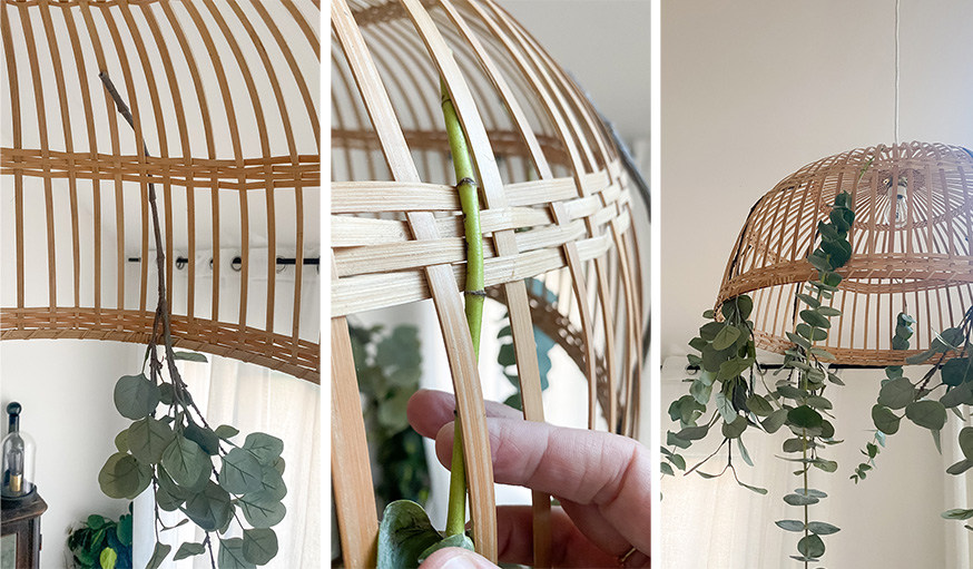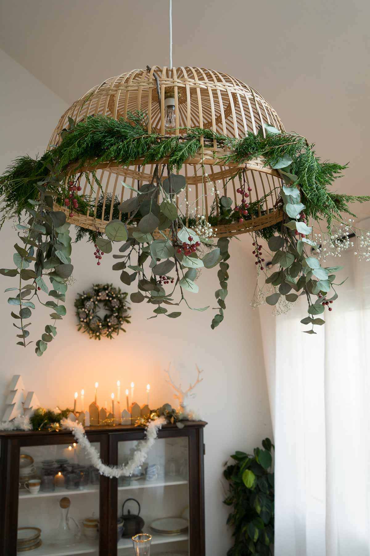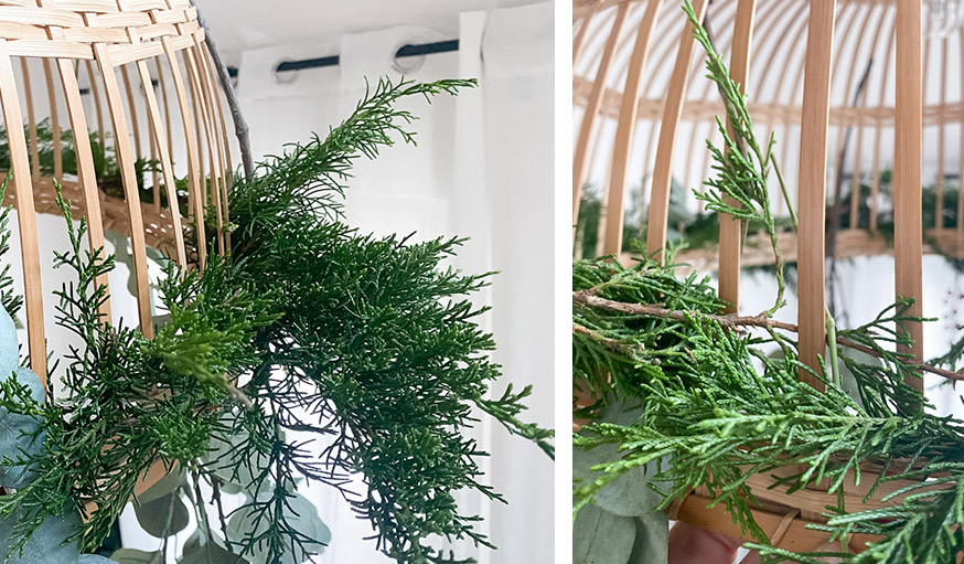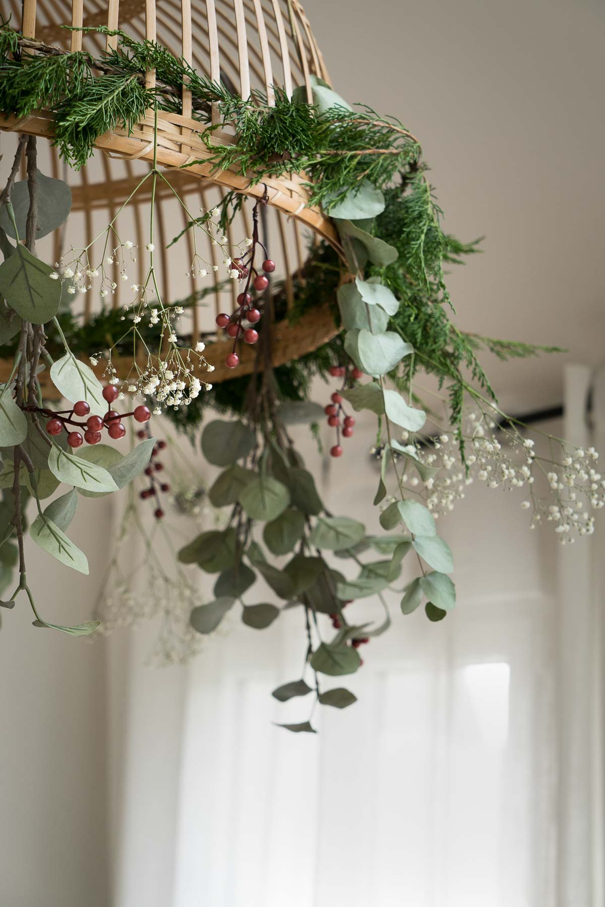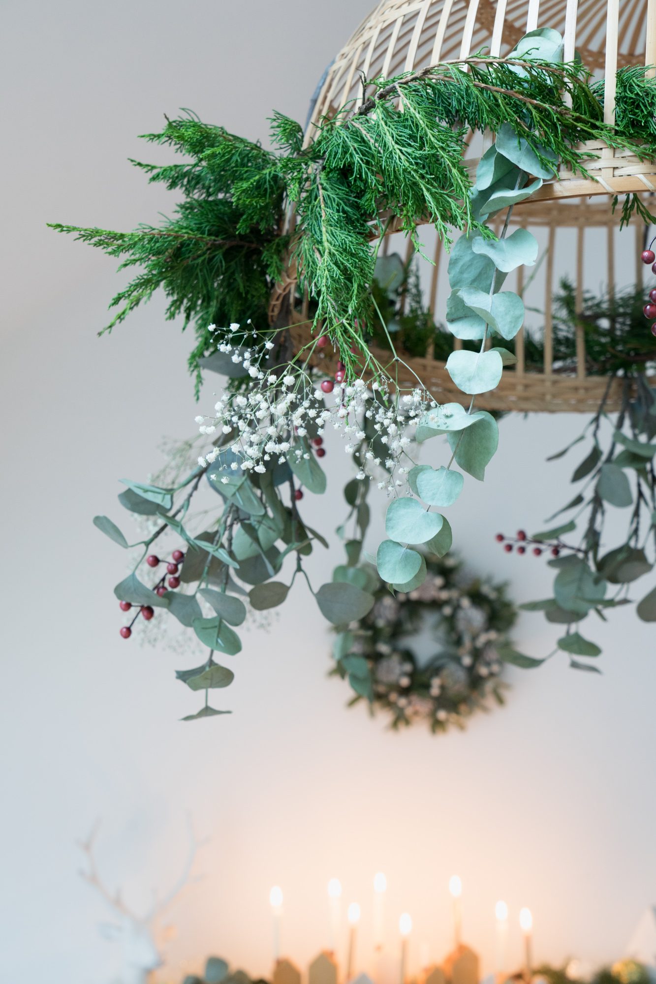 Ma table étant plutôt épurée, j’avais envie de réaliser un décor suspendu. Ici j’ai utilisé l’abat jour tressé de mon luminaire comme structure de base ! Si vous n’en avez pas, vous pouvez remplacer ou habiller le vôtre avec du grillage à poule. J’ai coincé des branches verticalement et horizontalement, ajouté quelques fausses baies et un peu de gypsophile. C’est très rapide à réaliser et cela habille la pièce je trouve !