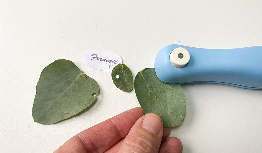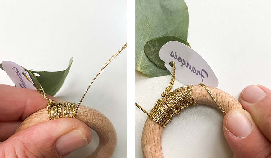 Vous avez des anneaux de rideaux en bois qui traînent chez vous ? Percez un petit trou dans des feuilles d’eucalyptus à l’aide d’une perforatrice et enfilez-les sur un joli fil doré avec une étiquette marque place au prénom des invités. Enroulez le fil autour de votre anneau, glissez votre serviette à l’intérieur, et ajoutez une fausse baie rouge pour apporter un peu de relief. Simplissime mais efficace :)