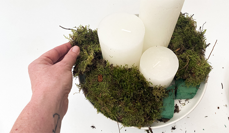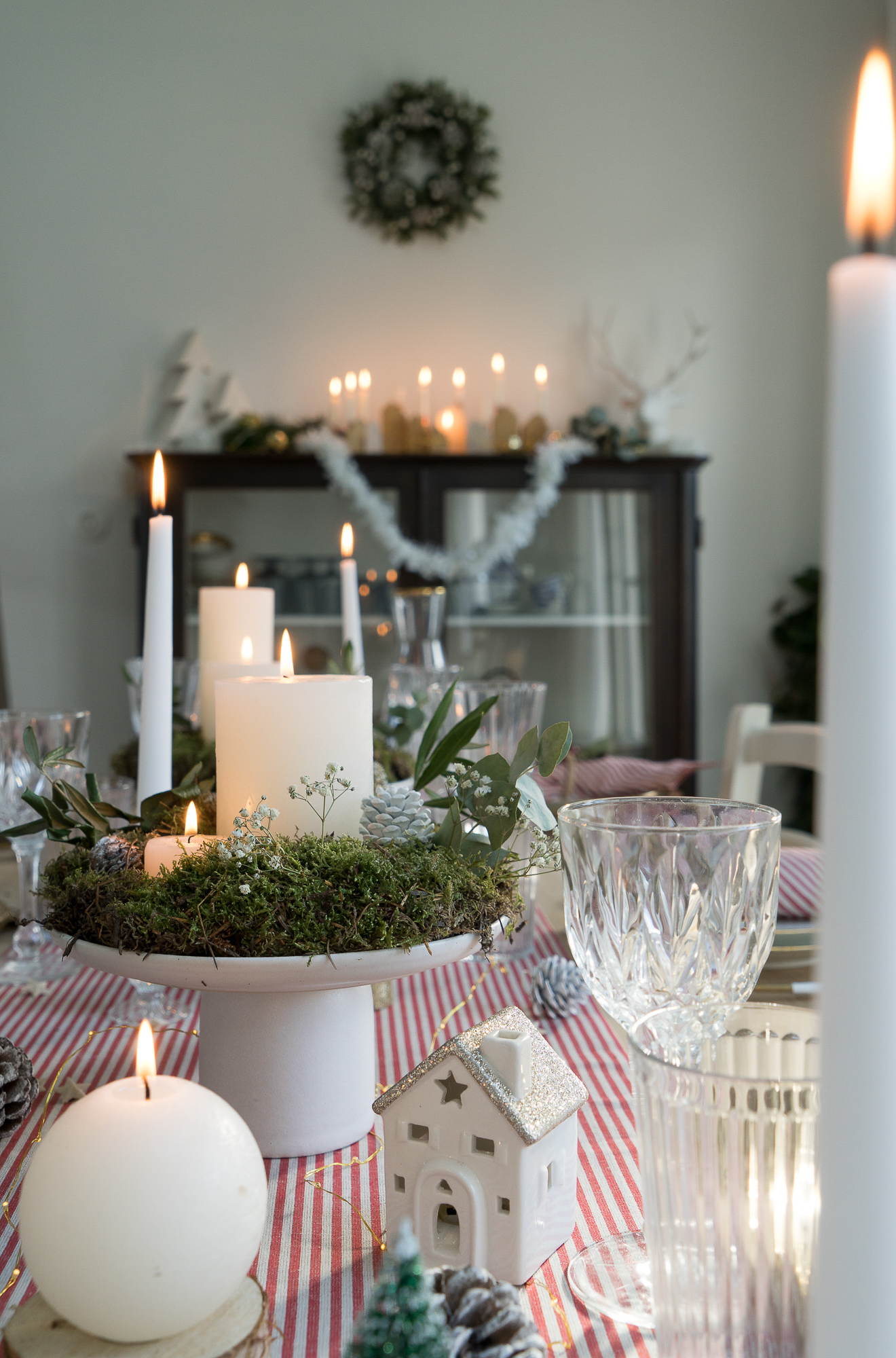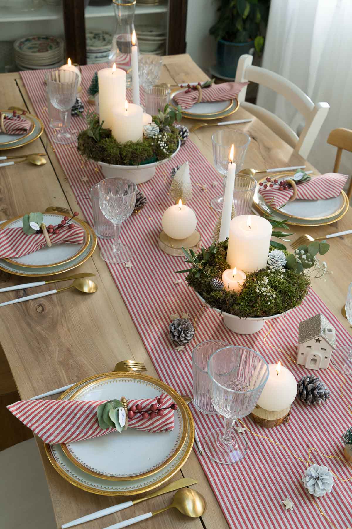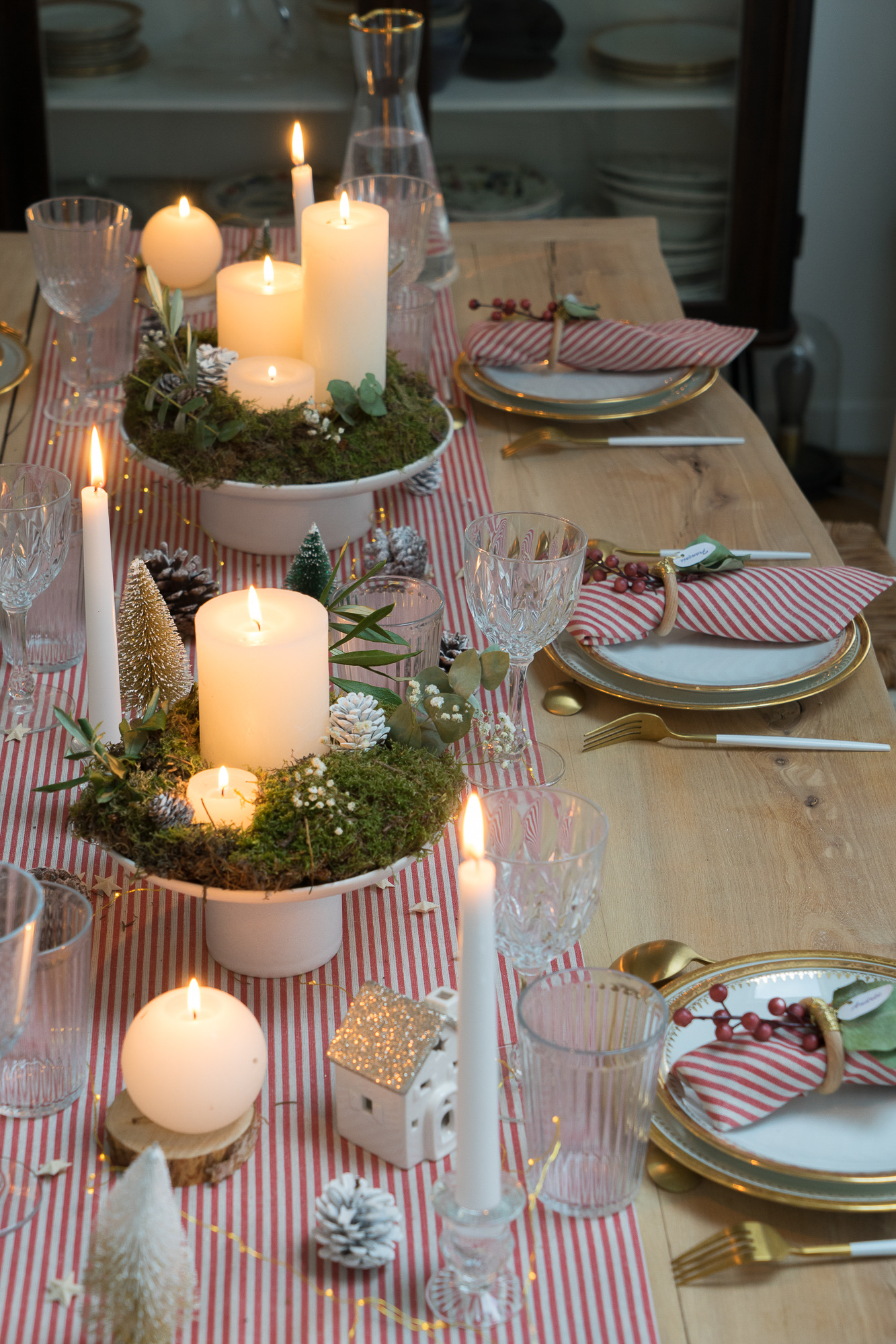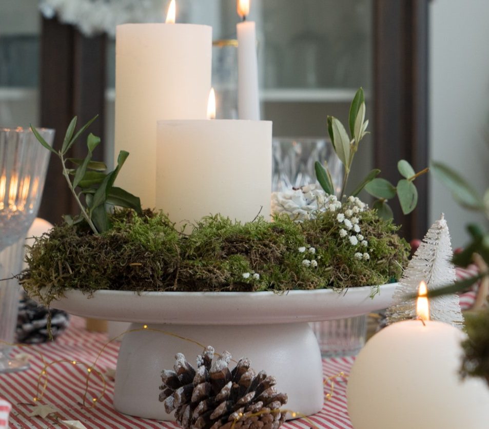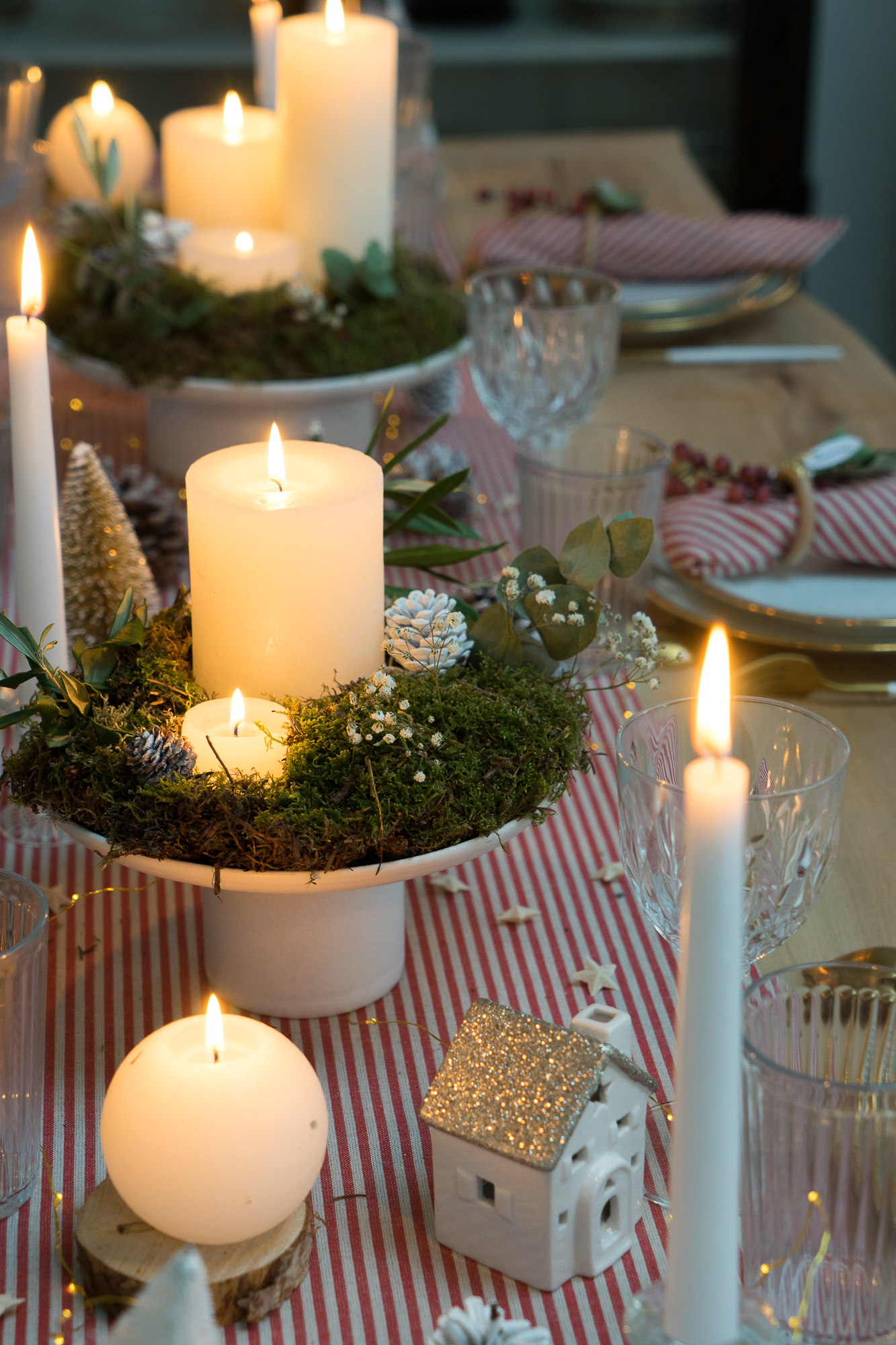 Ma table étant rectangulaire, j’ai choisi d’en créer deux (de taille et hauteur différentes). Si la vôtre est ronde, un seul peut suffire. J’ai ensuite disposé des bougies au centre, de la mousse de fleuriste autour et habillé le tout avec de la mousse naturelle. Vous en trouverez en jardinerie mais aussi sous les arbres et les coins ombragés si vous avez la chance d’avoir un jardin ! On vient y piquer quelques branches d’eucalyptus et gypsophile par exemple, on ajoute une ou deux petites pommes de pin, et le tour est joué !