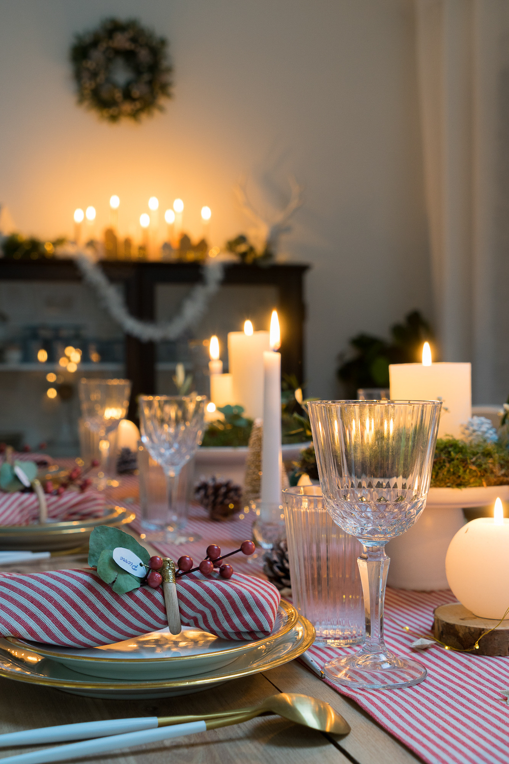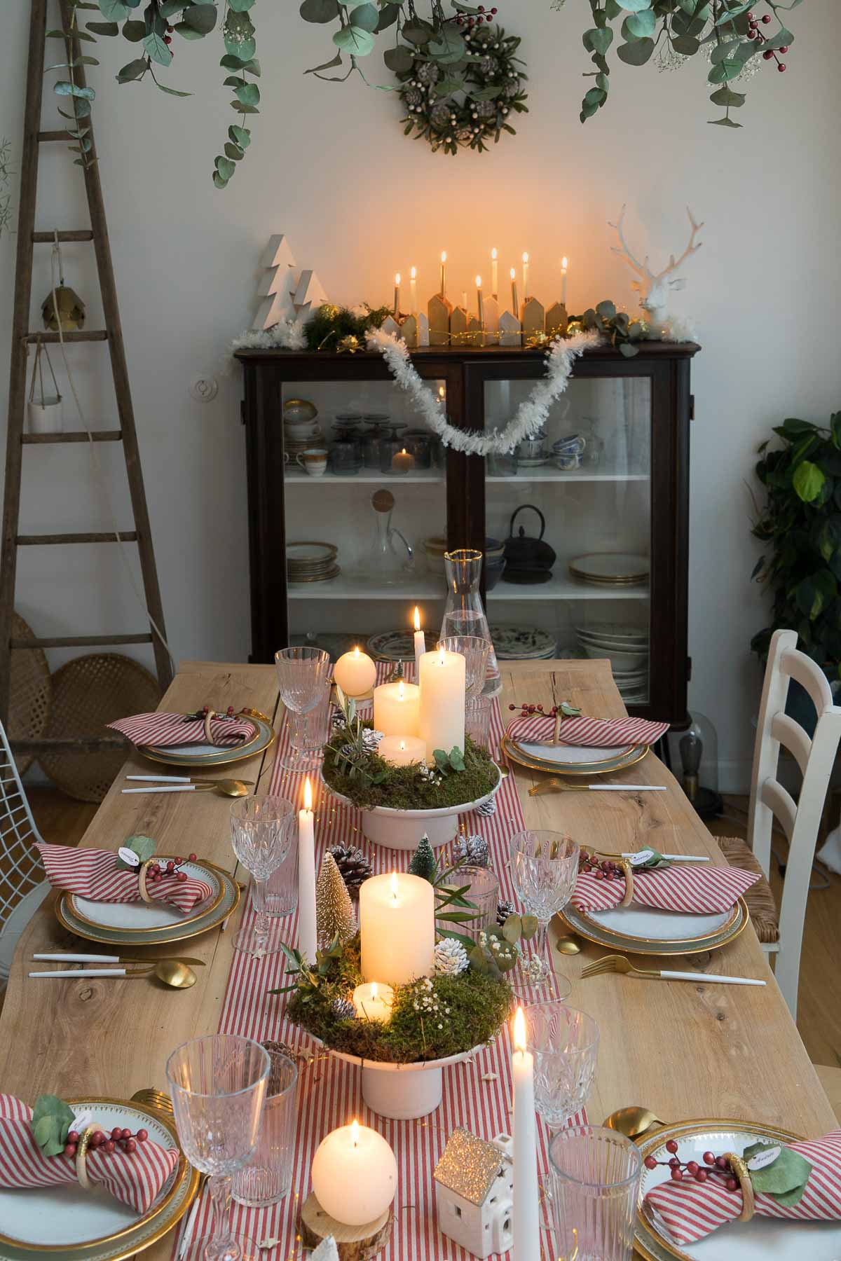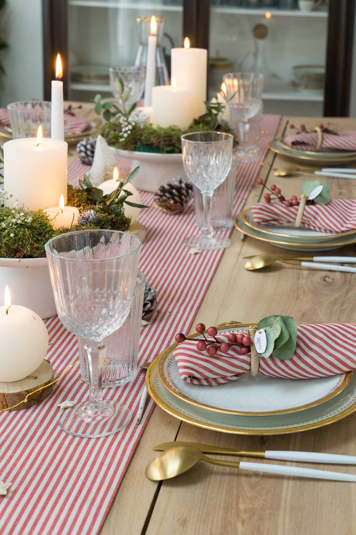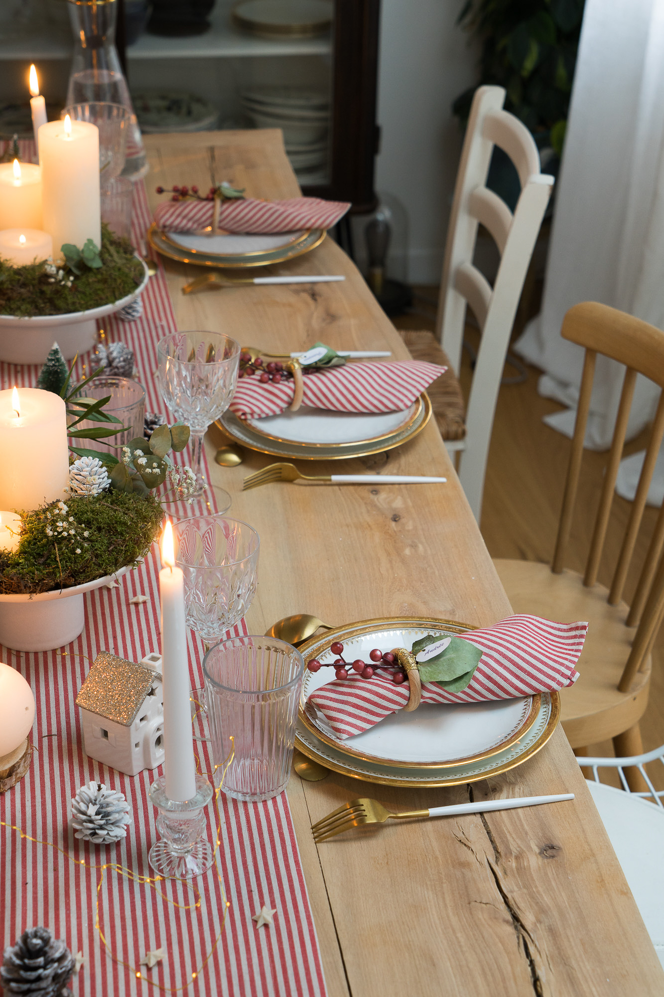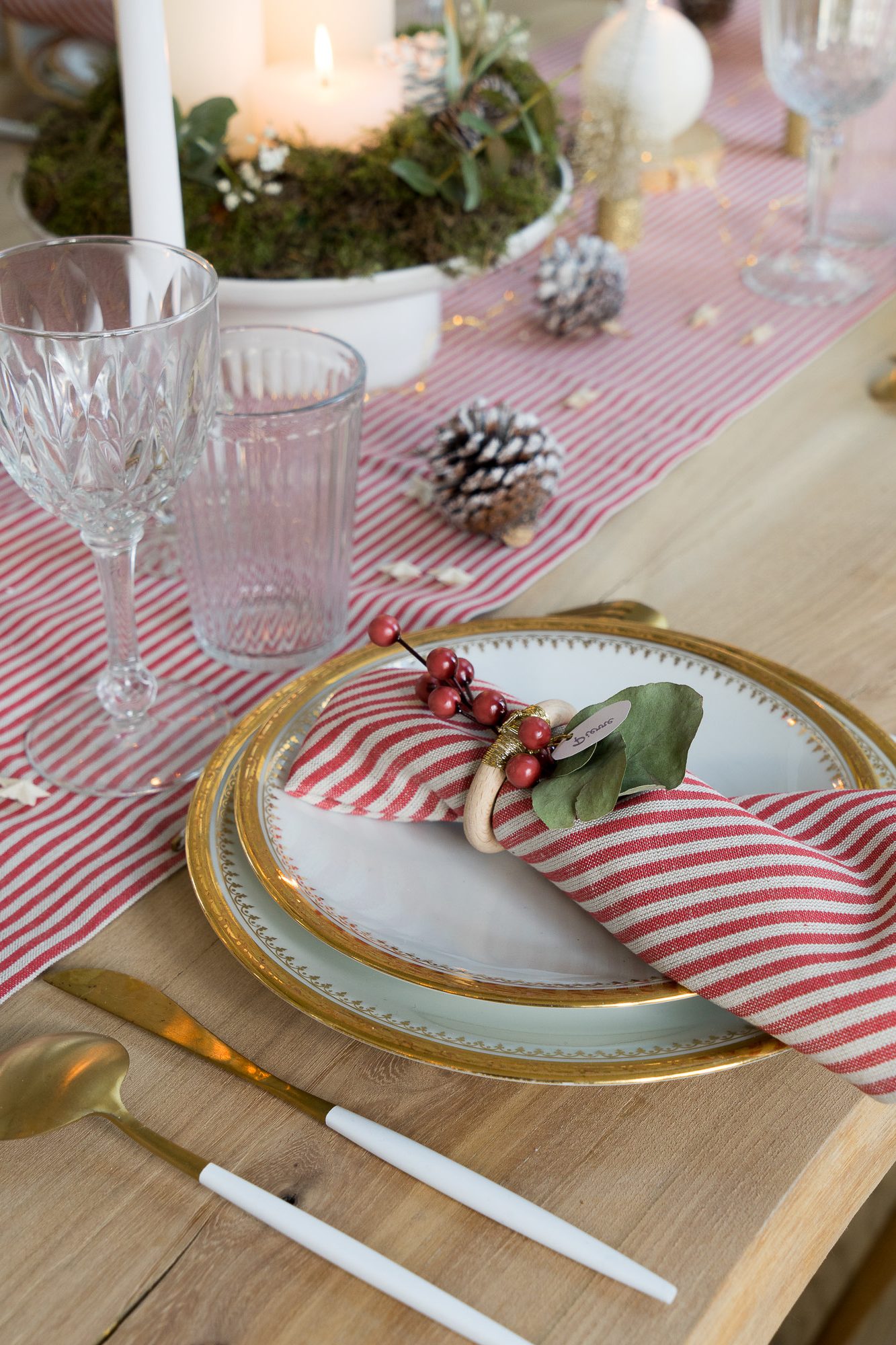 Pour cette table de Noël en rouge et vert, la palette était très claire : du rouge avec ce chemin de table et ces serviettes rayées assorties de la marque LinenMe que j’adore, et quelques baies artificielles. Du vert avec les végétaux. Et pour le reste, du blanc et du bois uniquement ! Le blanc vient illuminer l’ensemble et apporter de la légèreté, mais il a aussi l’avantage d’être présent dans la plupart des armoires à vaisselle. Même si vous possédez peu de vaisselle, ce type de déco de table peut donc être reproduit facilement. Ici j’ai utilisé des assiettes blanches de famille avec une joli liseré doré, mais des assiettes blanches toutes simples conviennent aussi. Toutes les bougies sont blanches également, et j’ai bombé quelques pommes de pin que j’avais ramassé à l’aide d’une bombe à neige. Vous pouvez également en trouver des toutes prêtes dans le commerce.
